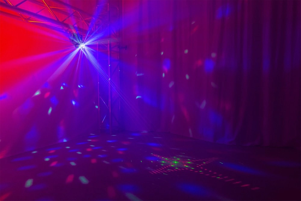 Oprócz kolorowego efektu Jelly Ball, model DJ10 oferuje także laser RG (Red/Green). Wbudowane obrotowe soczewki dzielą wiązkę światła na setki promieni, tworząc dynamiczny efekt rozgwieżdżonego nieba. Dzięki ruchowi lasera i intensywnym kolorom, idealnie sprawdzi się na imprezy, domówki, dla DJ-a czy do klubu.
