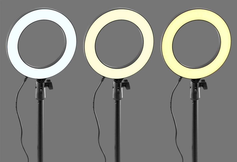 Lampa pierścieniowa ma 3 stopnie regulacji temperatury barwowej (zimną biel, mieszaną i ciepłą biel), które można zmieniać w zależności od pożądanego efektu.