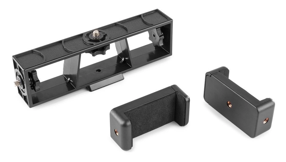 Lampa pierścieniowa jest wyposażona w dwa uchwyty na smartfony. Dzięki uniwersalnemu gwintowi istnieje możliwość mocowania lampy z boku.