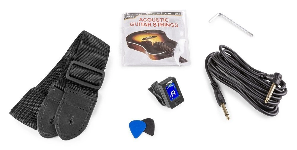 Podłącz gitarę do dołączanego w zestawie 40- watowego wzmacniacza i zaprezentuj swoje umiejętności większej publice. Prezentowana Gitara jest to pełnowymiarowy model Dreadnought z wycięciem. Przeznaczony dla każdego użytkownika powyżej dziesiątego roku życia. Oprócz gitary i wzmacniacza zestaw zawiera kostki, pokrowiec na gitarę, tuner cyfrowy, kabel gitarowy oraz zestaw zapasowych strun, co sprawia że kupując ten zestaw niemal natychmiast jesteś gotowy by rozpocząć lub kontynuować swoją przygodę z nauką gry bądź zaprezentować swoje umiejętności znajomym albo rodzinie.