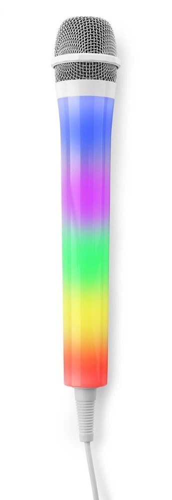 Dzięki mikrofonowi Fenton KMD Twój występ stanie się niezapomnianym przeżyciem. Mikrofon ma wbudowane efekty świetlne w wielu kolorach, które zmieniają się losowo lub w zależności od rytmu muzyki, zapewniając dodatkową atmosferę i przytulność podczas wieczoru karaoke. Włóż 3 dołączone baterie AAA do mikrofonu, podłącz go i możesz śpiewać. Mikrofonu możesz używać do występów wokalnych lub karaoke.