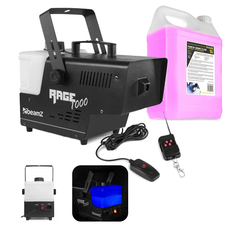którzy chcą dużo dymu Dzięki BeamZ RAGE1000 masz potężną maszynę do dymu o mocy 1000W do wytwarzania dużej ilości dymu. Maszyna jest wyposażona w duży 2- litrowy zbiornik, dzięki czemu można ją napełnić odpowiednią ilością płynu do dymu na wiele wieczornych imprez. Pod zbiornikiem umieszczono diodę LED, która w czytelny sposób wskazuje poziom cieczy w zbiorniku. Dzięki dużej mocy 1000W RAGE1000 jest w stanie wyprodukować nie mniej niż 125 m³ na minutę. To sprawia, że RAGE1000 jest idealną maszyną na większe imprezy.