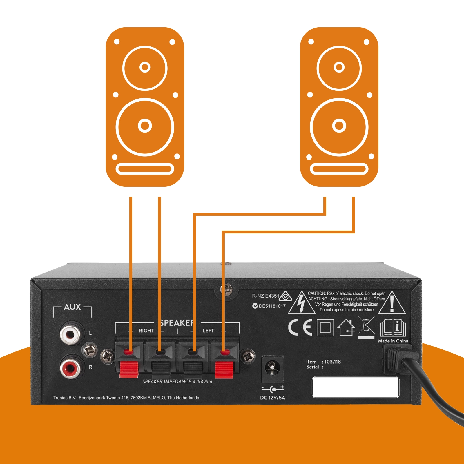 Sercem AV340 jest wzmacniacz cyfrowy 2x 50W. Wzmacniacze cyfrowe mogą być zbudowane bardzo małe i są niezwykle wydajne. To sprawia, że AV340 jest bardzo kompaktowy, bez utraty jakości. Z tyłu znajdują się zaciski zaciskowe do podłączenia głośników, więc nie potrzebujesz żadnych wtyczek, aby podłączyć kabel głośnikowy do wzmacniacza.