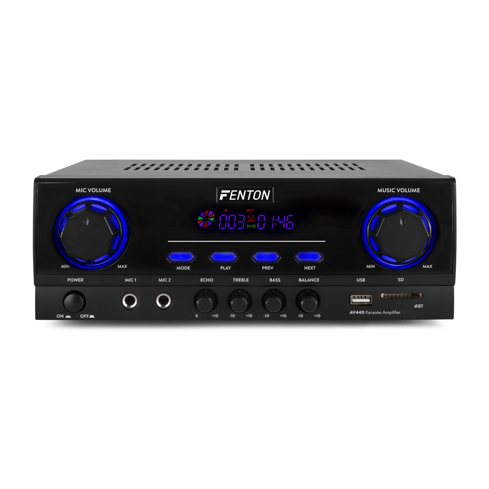 Wzmacniacz karaoke Fenton AV440 to cyfrowy wzmacniacz z dwoma wejściami mikrofonowymi, dzięki czemu możesz śpiewać razem. Dzięki funkcji Bluetooth w AV440 możesz łatwo stworzyć zestaw karaoke Bluetooth. Wbudowany odtwarzacz MP3 może odtwarzać muzykę MP3 bezpośrednio z pamięci USB, a do wejścia z tyłu można podłączyć dowolne zewnętrzne urządzenie audio. Aby uzyskać profesjonalny dźwięk, do sygnału z mikrofonu (-ów) można dodać efekt echa. Dzięki Fenton AV440 masz idealną podstawę do złożenia zestawu karaoke.