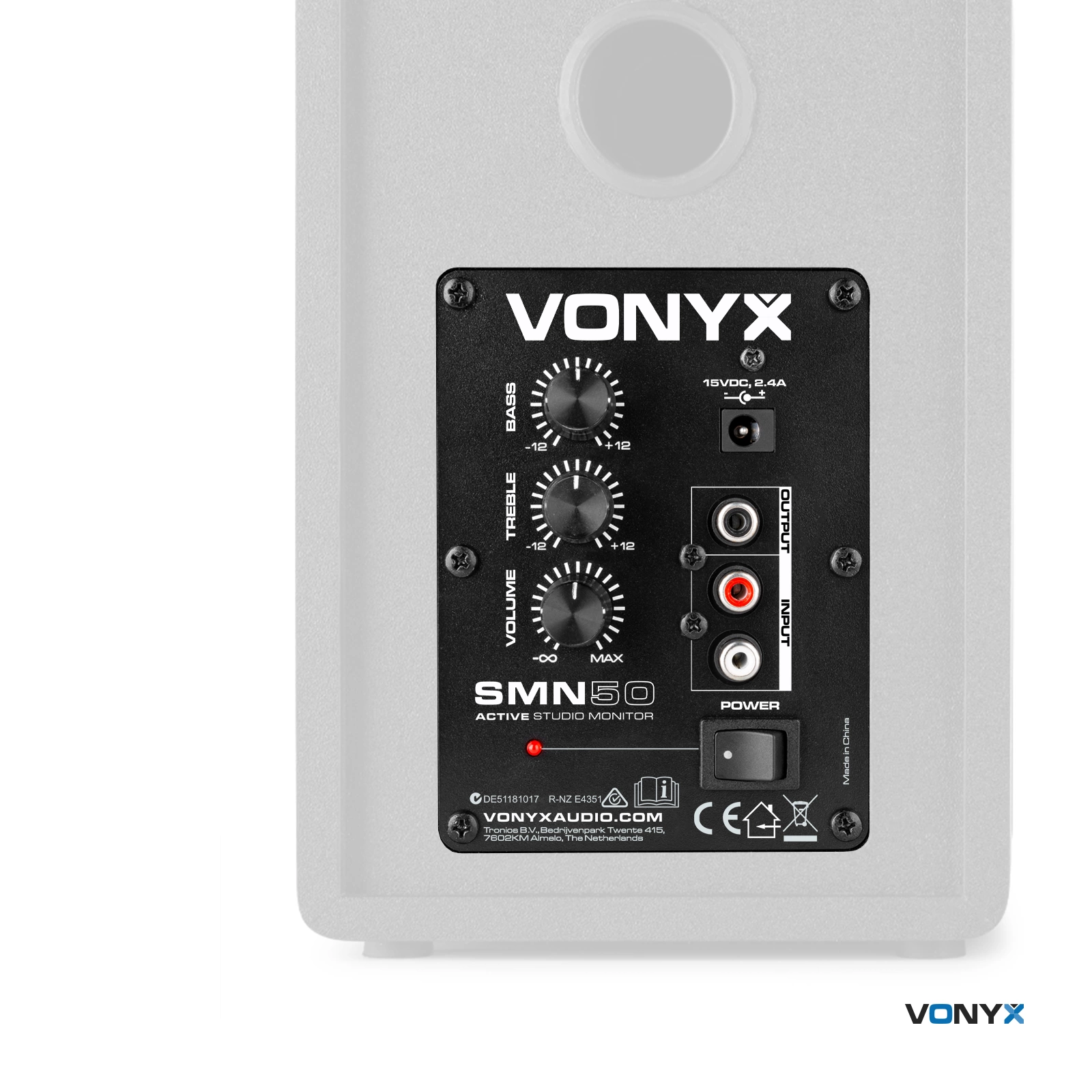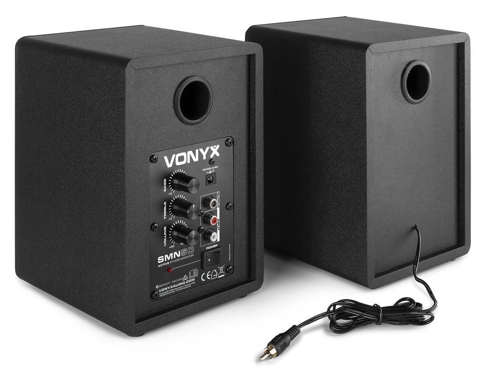 Vonyx SMN50B to zestaw dwóch głośników studyjnych. Wzmacniacz jest wbudowany w jeden z głośników, dzięki czemu można podłączyć zestaw bezpośrednio do komputera, laptopa, miksera, kontrolera DJ-a itp. Monitory są zaprojektowane tak, aby zapewnić płaską charakterystykę częstotliwościową, podczas nagrywania, miksowania i masteringu (w domu). SMN50B jest idealnym zestawem dla początkującego DJ-a lub producenta. Kompaktowy rozmiar ułatwia postawienie głośników np. na biurku.