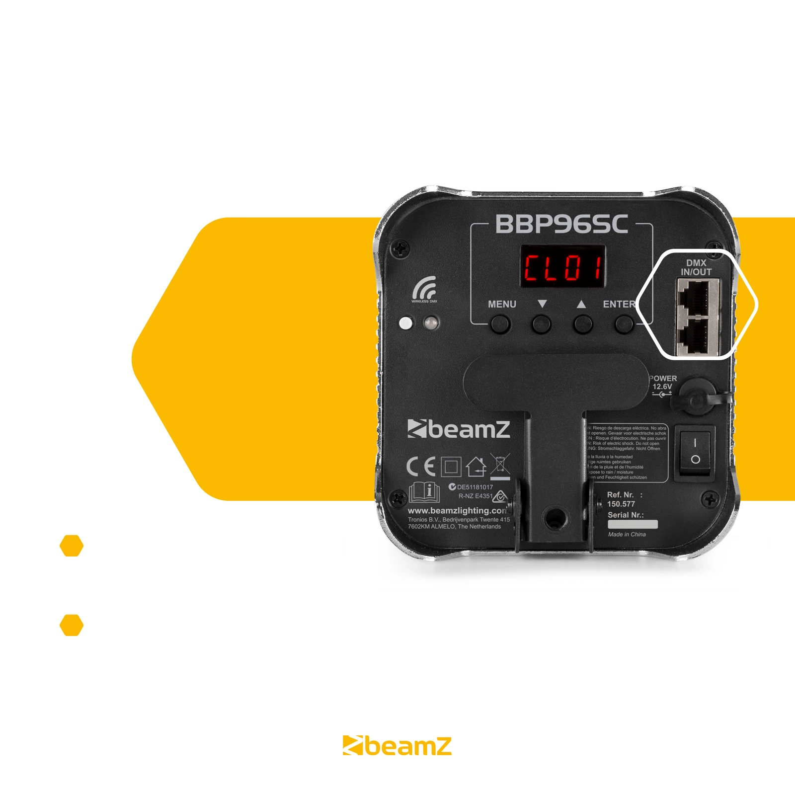 BBP96SC można łatwo sterować za pomocą menu na samej lampie, dostarczonego pilota lub przez DMX (możliwe bezprzewodowe). Czy chcesz mieć stały kolor czy ciągły gradient kolorów? Można to łatwo ustawić na samej lampie, nie jest do tego wymagana osobna jednostka sterująca. Lokalizacja z wieloma ustalonymi kolorami to więc bułka z masłem, co sprawia, że BBP96SC jest idealny do wynajmu lub dla firm cateringowych i imprezowych. Chcesz trochę więcej? Zdalnie sterowany pokaz świetlny z jednym lub więcej spotami BBP96SC, wtedy sterowanie DMX jest idealne. I tutaj również dobrze przemyślano, ponieważ BBP96SC jest wyposażony w bezprzewodowy DMX, więc nie musisz do niego układać kabli. Korzystając z bezprzewodowego nadajnika DMX BeamZ, możesz łatwo sterować jednym (lub więcej) Uplighterem BBP96SC, zapewniając pełne sterowanie bezprzewodowe. W razie potrzeby BBP96SC można również po prostu podłączyć do kontrolera DMX za pomocą kabli DMX. Ponieważ BBP96SC jest wyposażony w złącza RJ45 DMX, dołączony jest adapter.