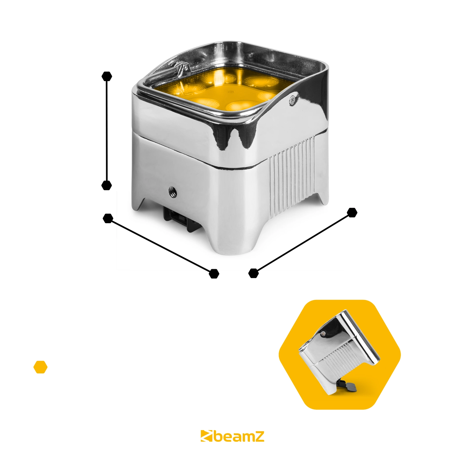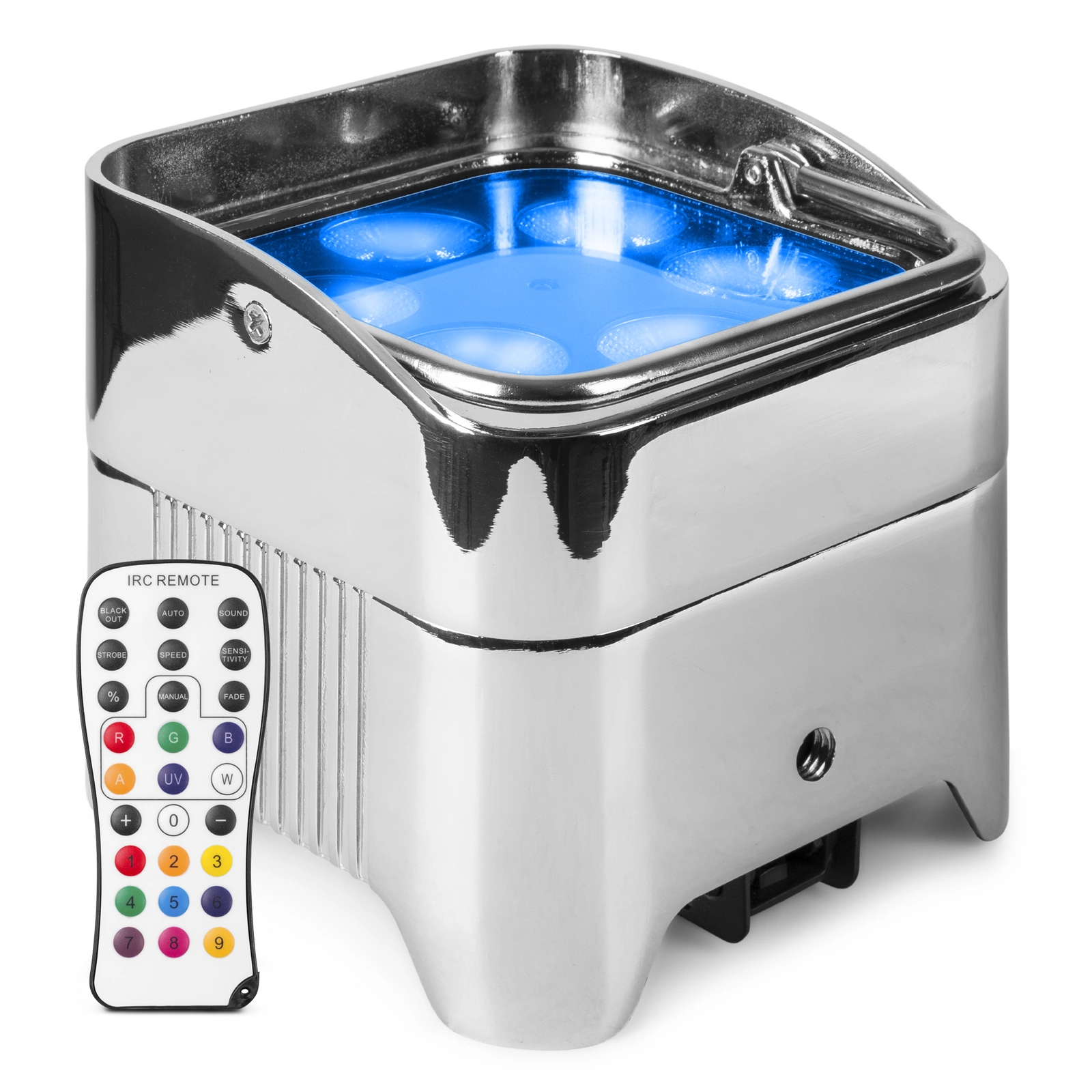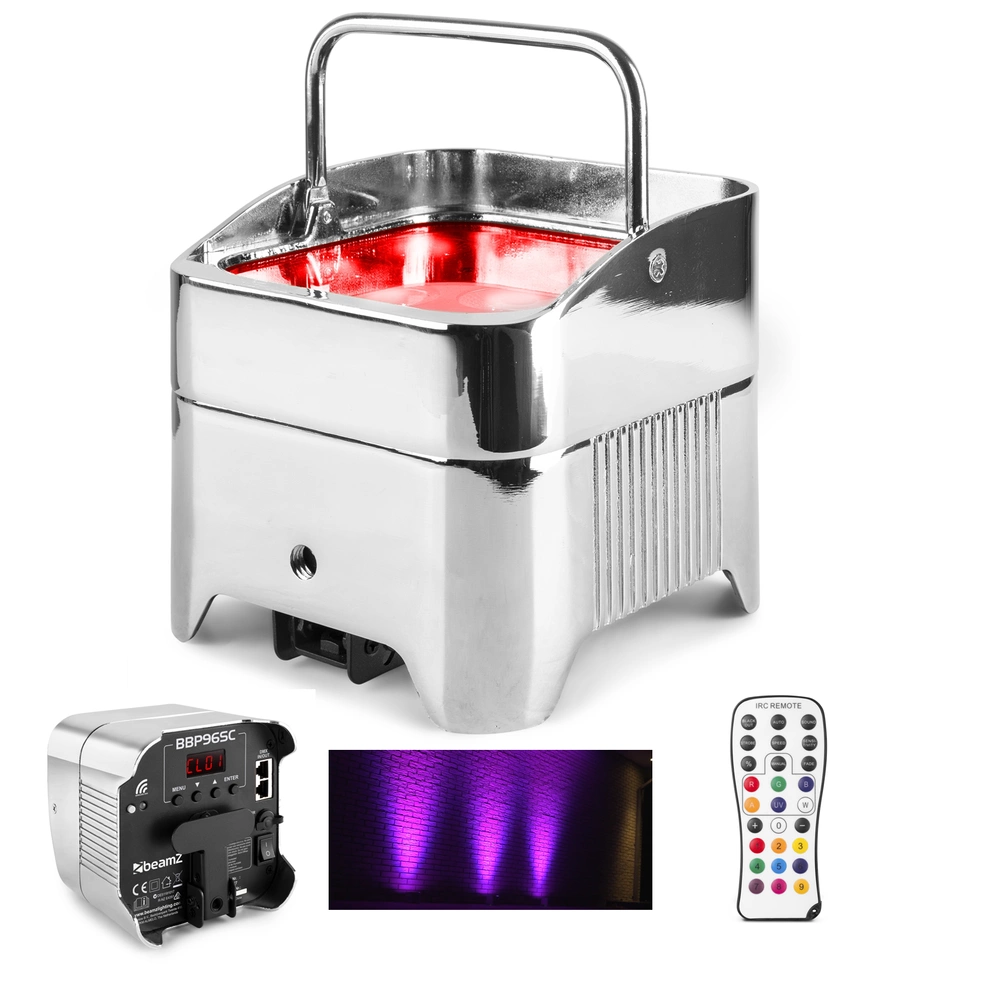 BeamZ BBP96SC Uplight z wbudowanym akumulatorem to kompaktowy, chromowany Uplighter wyposażony w 6x 12W LED. Dzięki wbudowanemu akumulatorowi lampa nie musi być podłączana do gniazdka, więc z BBP96SC można naprawdę pracować wszędzie. Przy naładowanej baterii BBP96SC może być używany przez dobre 9 godzin na przykład do oświetlania ścian lub przedmiotów. Wyposażony jest w specjalną podstawę, dzięki czemu można go ustawić pod kątem. Wbudowany bezprzewodowy moduł DMX umożliwia sterowanie lampą za pomocą nadajnika DMX.