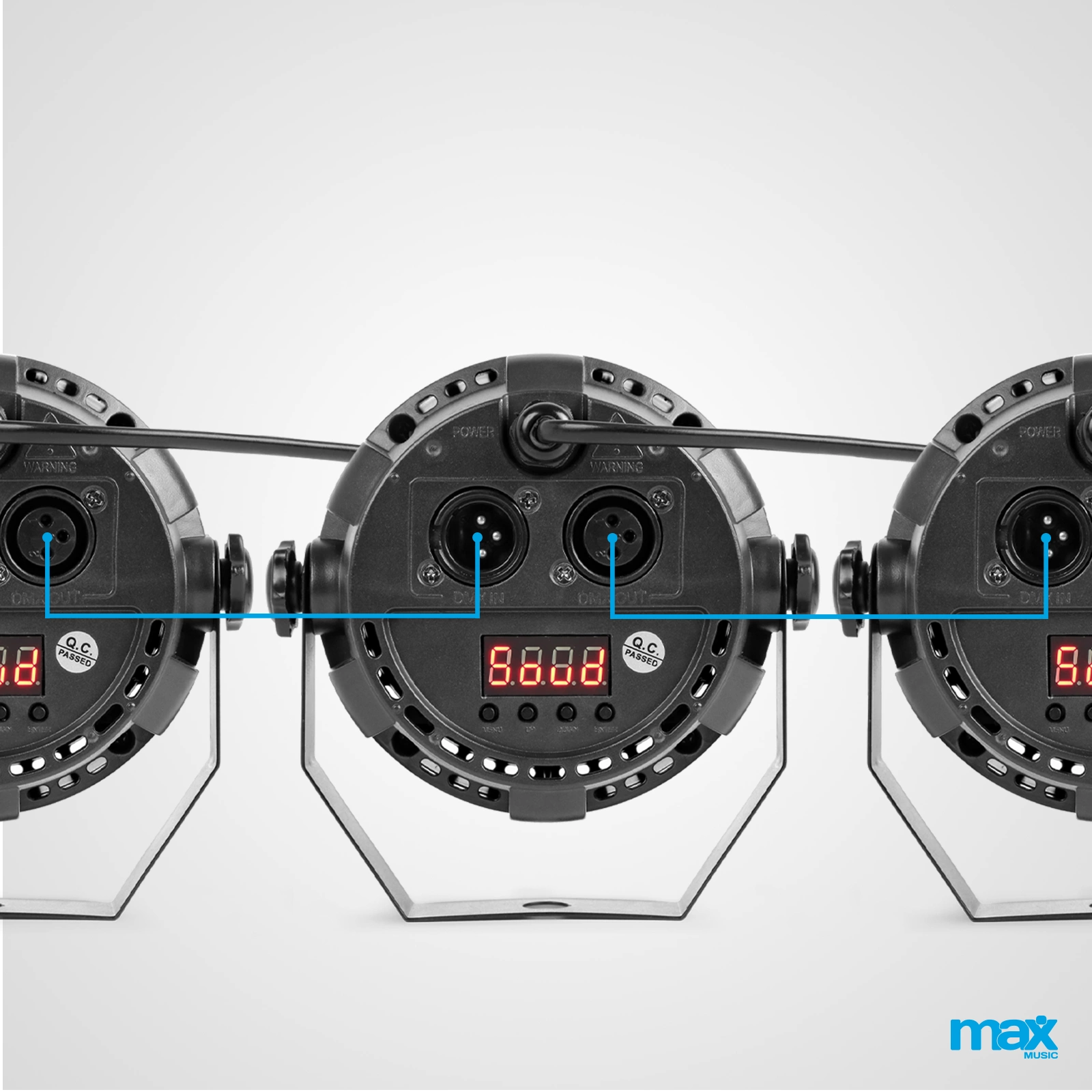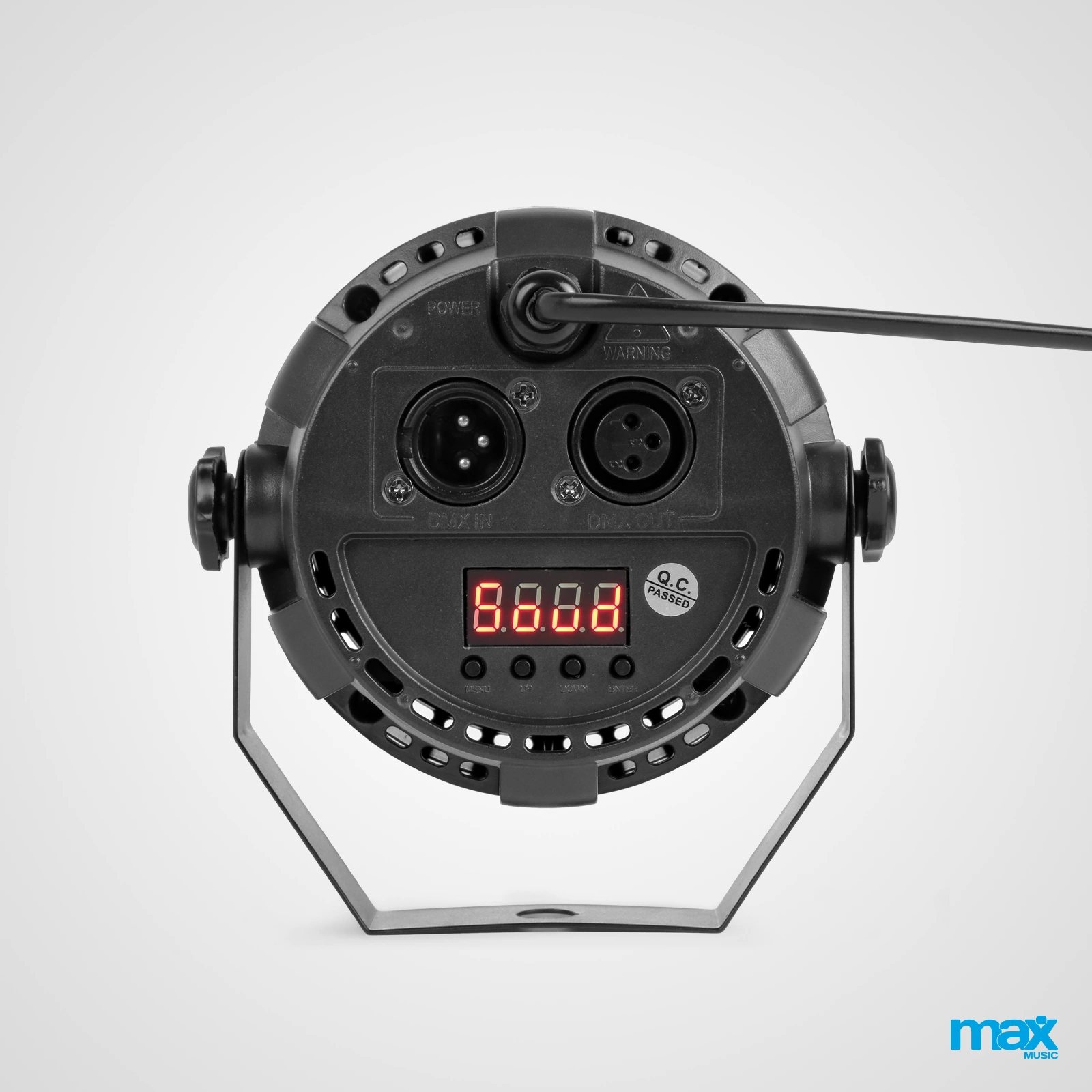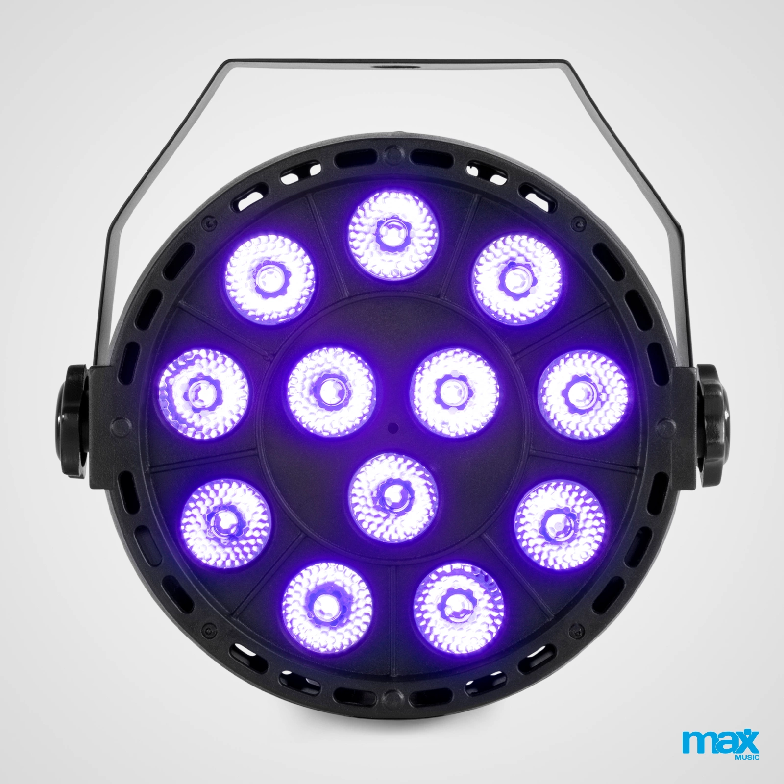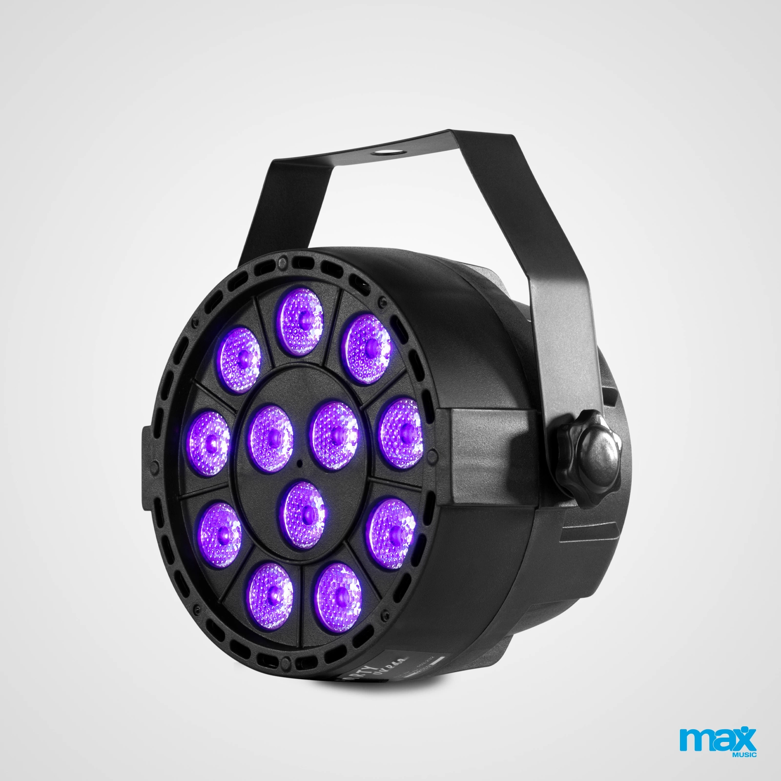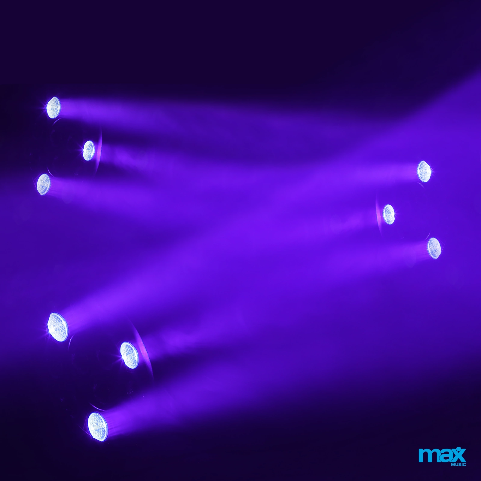 Z 12 diodami LED o mocy 1W na diodę, MAX Blacklight PartyPar jest bezkonkurencyjny pod względem ceny. Ponadto jest sterowany za pomocą DMX, ma wewnętrzny mikrofon do sterowania dźwiękiem, może pracować na wbudowanym programie, a nawet możliwe jest połączenie wielu jednostek razem w celu ustawienia master/ slave. 12 diod LED jest podzielonych na 4 sekcje, dzięki czemu na samej lampie można uzyskać ładne efekty.