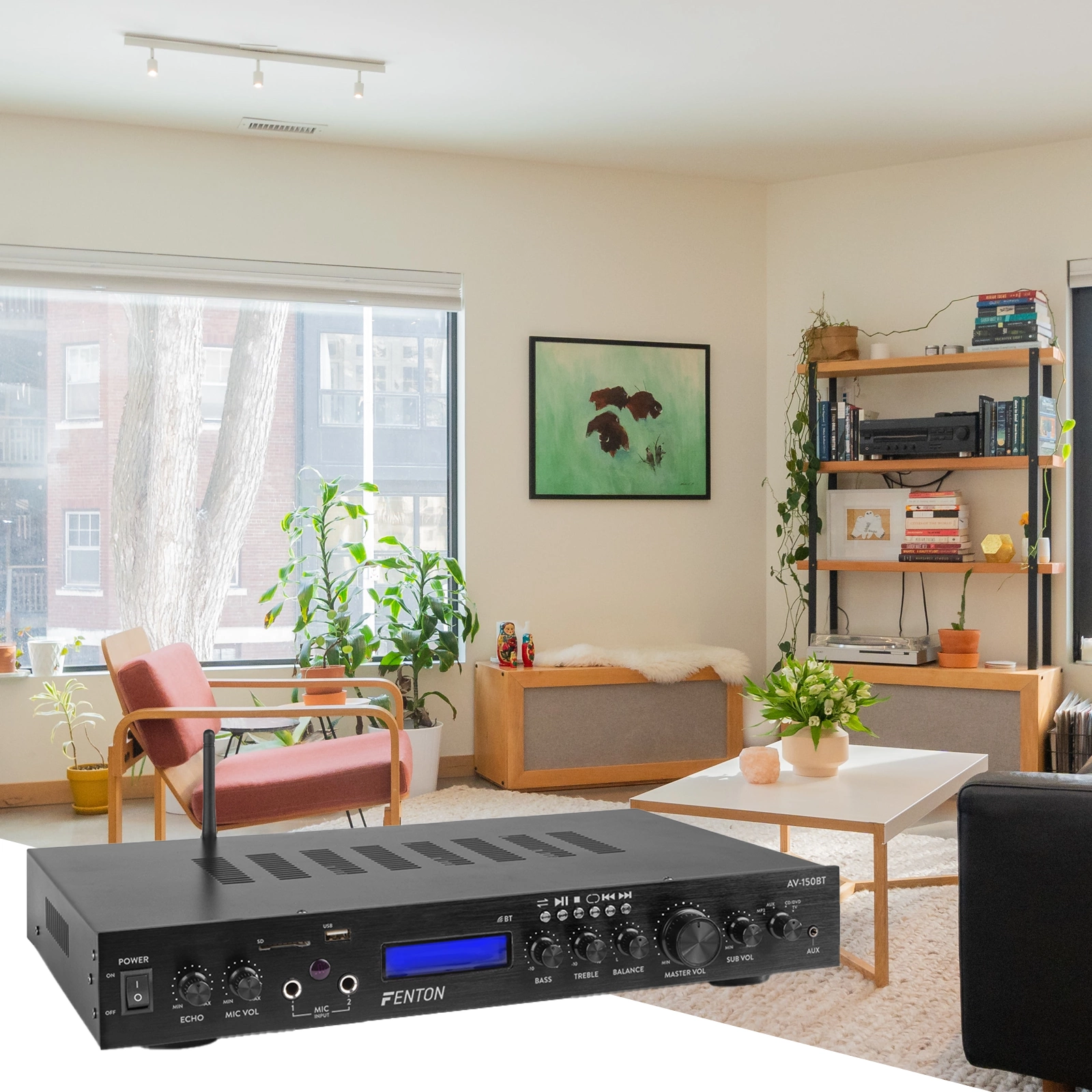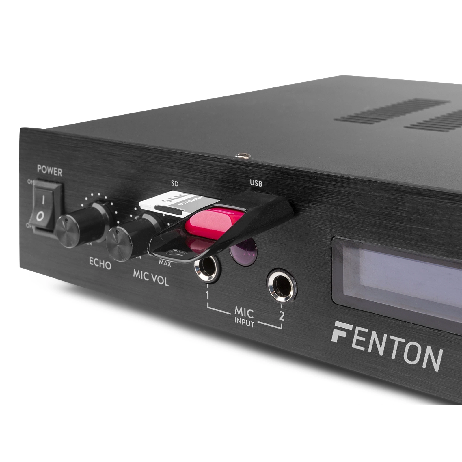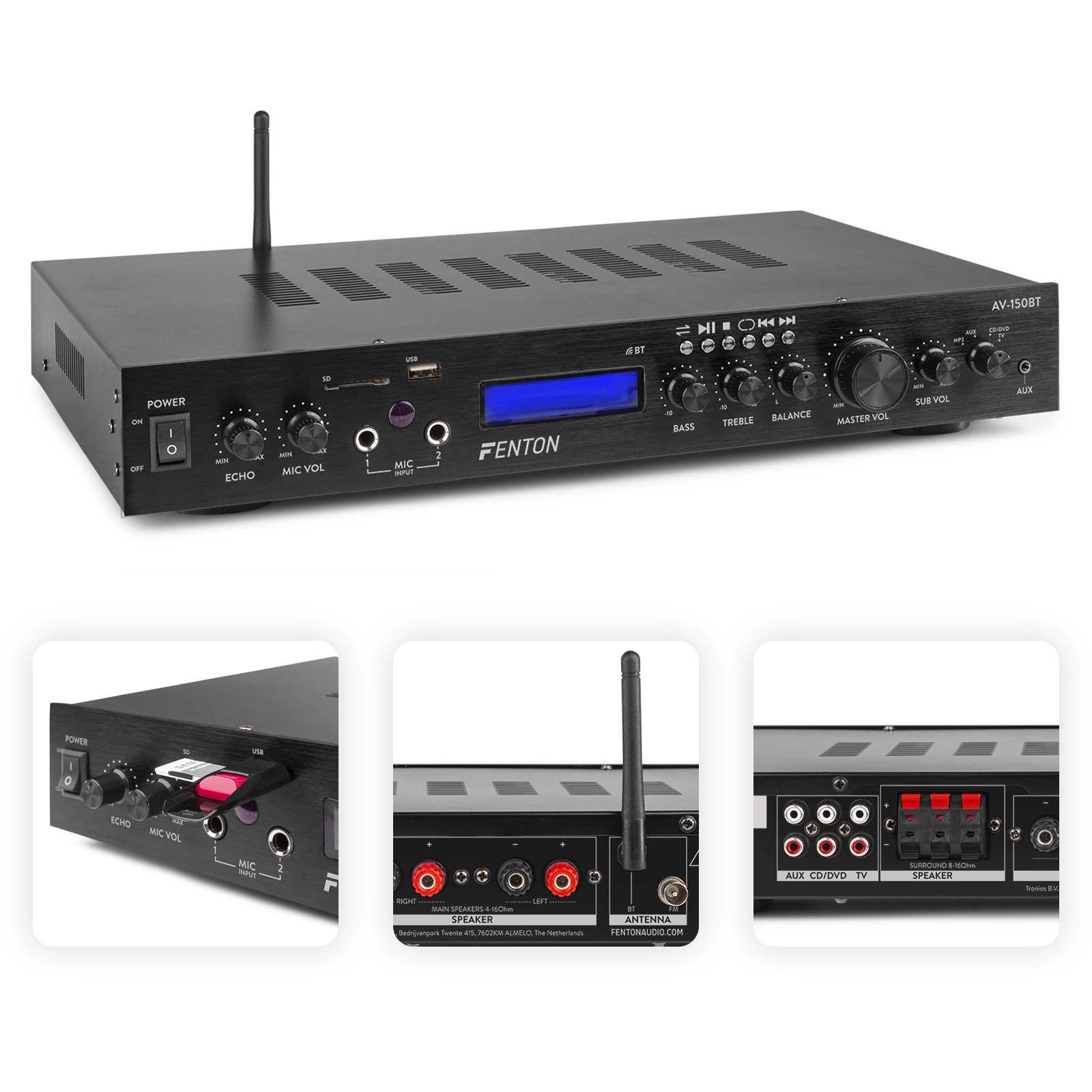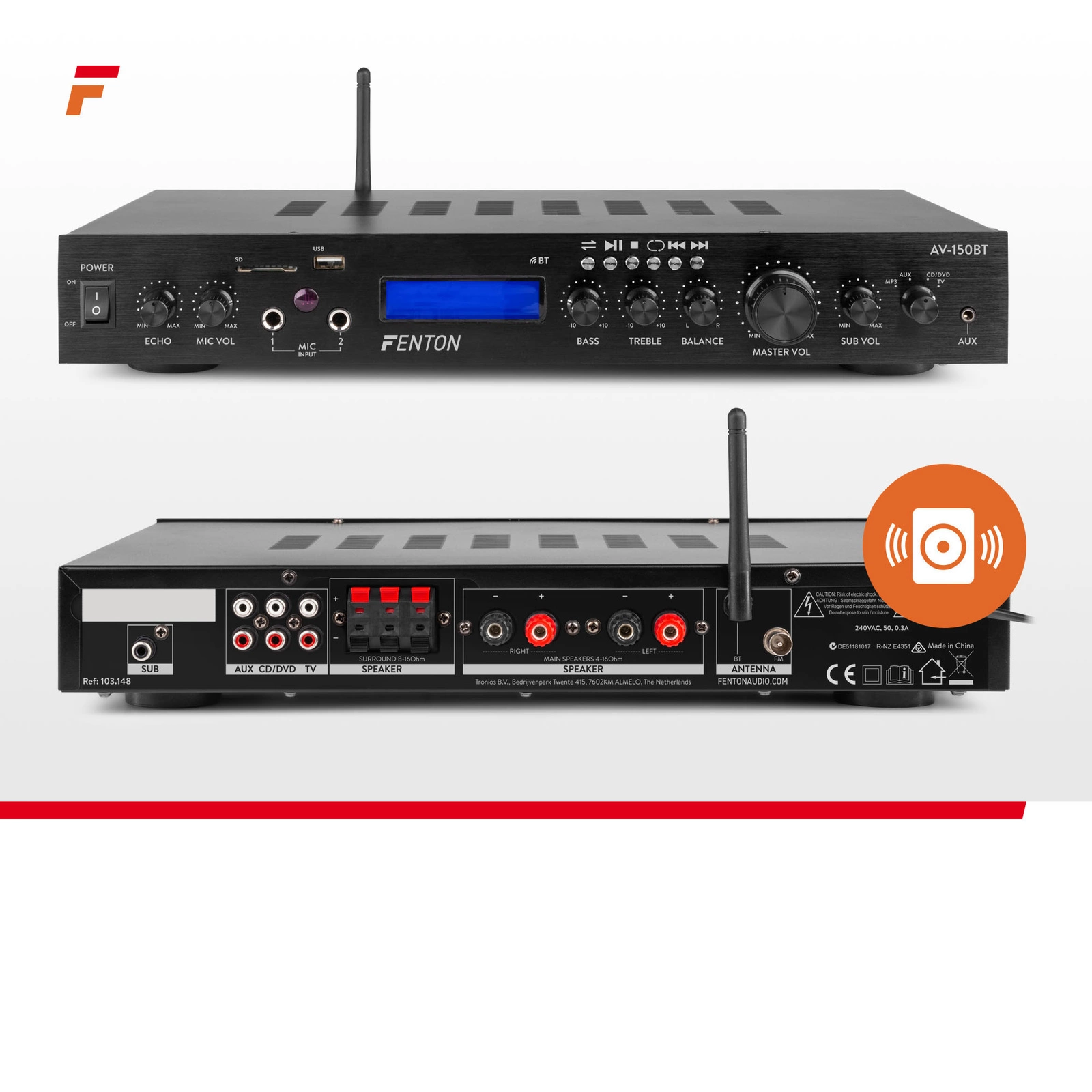 Dzięki Fenton AV-150BT masz idealną podstawę dla pięknego systemu surround. Ten wzmacniacz 5.1 spełnia wszystkie współczesne potrzeby, ponieważ jest wyposażony w Bluetooth i odtwarzacz MP3. Dzięki podwójnemu wejściu mikrofonowemu AV-150BT może być również używany jako wzmacniacz karaoke. Wzmacniacz kina domowego w połączeniu z dobrze dopasowanym zestawem głośników zapewnia spełnienie wszystkich Twoich potrzeb audio.