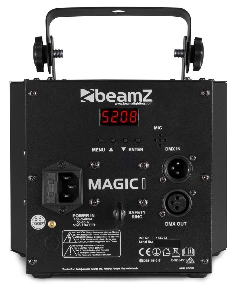 BeamZ Magic1 może być używany na różne sposoby. Za pomocą oddzielnie dostępnego kontrolera DMX można zdalnie sterować Magic1, przy czym w zależności od kontrolera możliwe jest tworzenie własnych programów. Na przykład można ustawić prędkość lub efekt. Inną opcją są tryby sterowane muzyką i tryby automatyczne. Dzięki tym dwóm opcjom Magic1 działa całkowicie niezależnie od muzyki lub jednego z wbudowanych programów. Wystarczy raz go ustawić i gotowe! Za pomocą wyświetlacza i odpowiednich czterech przycisków można łatwo poruszać się po menu, aby ustawić żądany efekt świetlny.