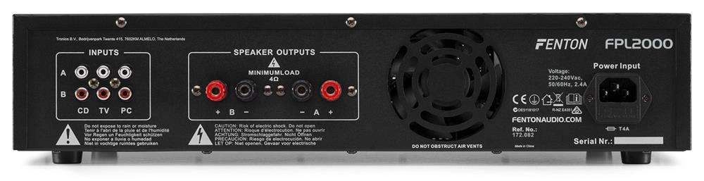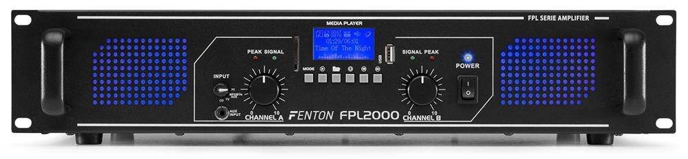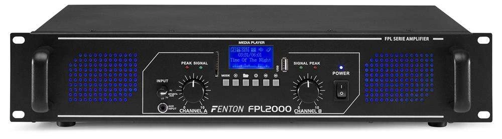 Fenton FPL2000 to cyfrowy wzmacniacz o mocy 2x 1000W. Wzmacniacz wyposażony jest w Bluetooth oraz wbudowany odtwarzacz MP3. To sprawia, że odtwarzanie muzyki jest bardzo łatwe. Panel przedni jest oświetlony od wewnątrz niebieskimi diodami LED, co zapewnia ciekawy wygląd. Z tyłu znajdują się 3 wejścia liniowe do podłączenia zewnętrznego sprzętu audio. Z przodu znajduje się wejście AUX jack 3,5mm, do którego można również podłączyć zewnętrzne źródło dźwięku. Cyfrowa technologia klasy D sprawia, że FPL2000 jest wysokowydajnym wzmacniaczem zapewniającym maksymalną wydajność.