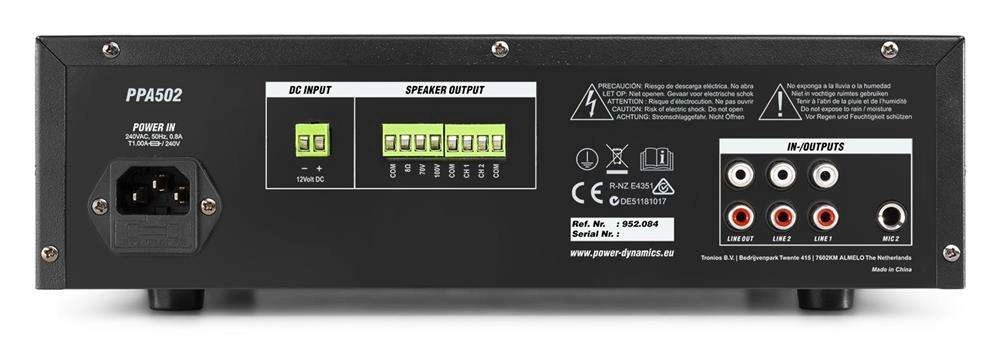 Power Dynamics PPA502 to wzmacniacz 100V o mocy 50W. Wzmacniacz posiada 2 strefy, których głośność można regulować niezależnie od siebie. Dzięki temu idealnie nadaje się do niewielkich podkładów muzycznych lub nagłośnienia, np. w sklepach, barach, poczekalniach itp. Wzmacniacz jest wyposażony w Bluetooth do bezprzewodowego przesyłania dźwięku np. z telefonu lub tabletu. W zestawie znajduje się również odtwarzacz MP3. Pilot jest dołączony do odtwarzacza MP3. Wzmacniacz posiada również 2 wejścia liniowe RCA i 2 wejścia mikrofonowe jack (6,3 mm), dzięki temu PPA502 może być używany zarówno w systemach muzycznych, jak i nagłośnieniowych (lub w połączeniu obu). Możliwe jest podłączenie do drugiego wzmacniacza za pomocą wyjścia liniowego RVC.