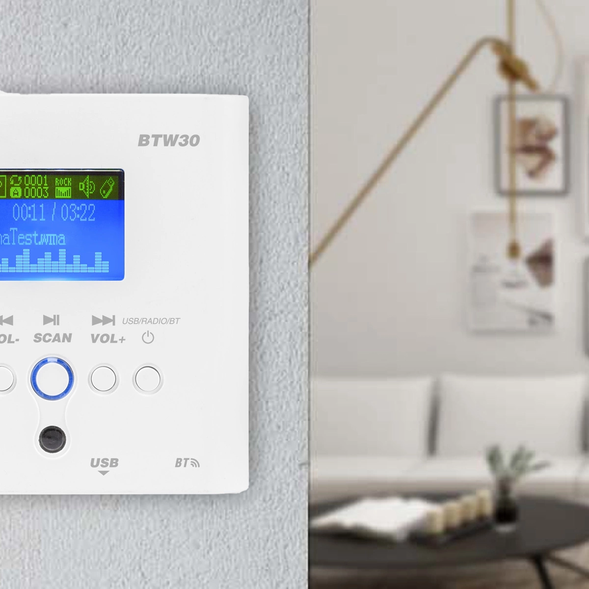 W dolnej części krawędzi BTW30 znajduje się złącze USB, do którego można podłączyć pamięć USB z MP3. Wbudowany wzmacniacz odtwarza następnie muzykę MP3 obecną na USB. Ponieważ port USB znajduje się na dole, pamięć USB jest równoległa do ściany i nie wystaje.