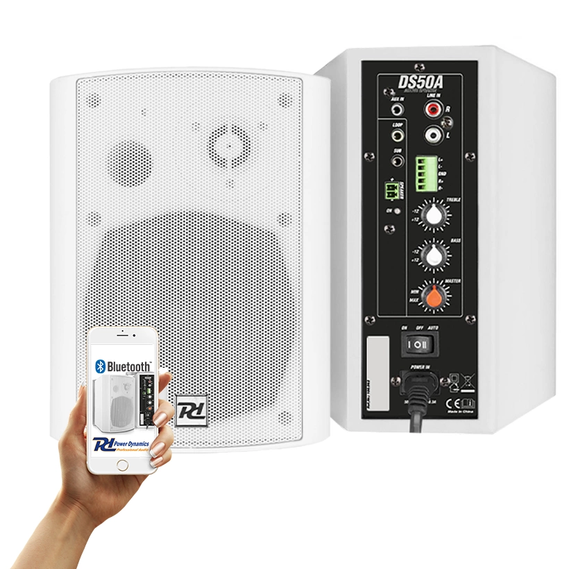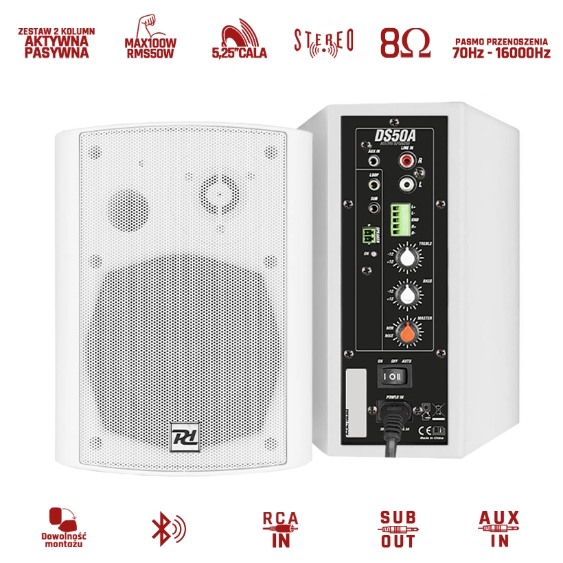 Dzięki DS50AW firmy Power Dynamics masz wiele możliwości. Zestaw jest idealny jako głośniki do komputera, ale także do szkół, tarasów ogródków restauracyjnych, biur itp. są to kolumny aktywne co za tym idzie posiadają wzmacniacz stereo klasy D. Ponieważ wzmacniacz jest wyposażony w Bluetooth, możesz łatwo nawiązać połączenie bezprzewodowe z telefonu, tabletu itp. Dostarczone uchwyty ścienne zapewniają, że można starannie zawiesić głośniki. Funkcja „auto-on” włącza odbiornik automatycznie po wykryciu sygnału muzycznego.