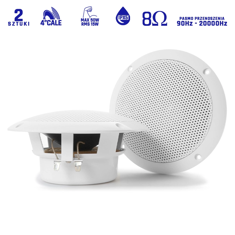 Zestaw 2 wodoodpornych głośników do montażu panelowego lub sufitowego.
