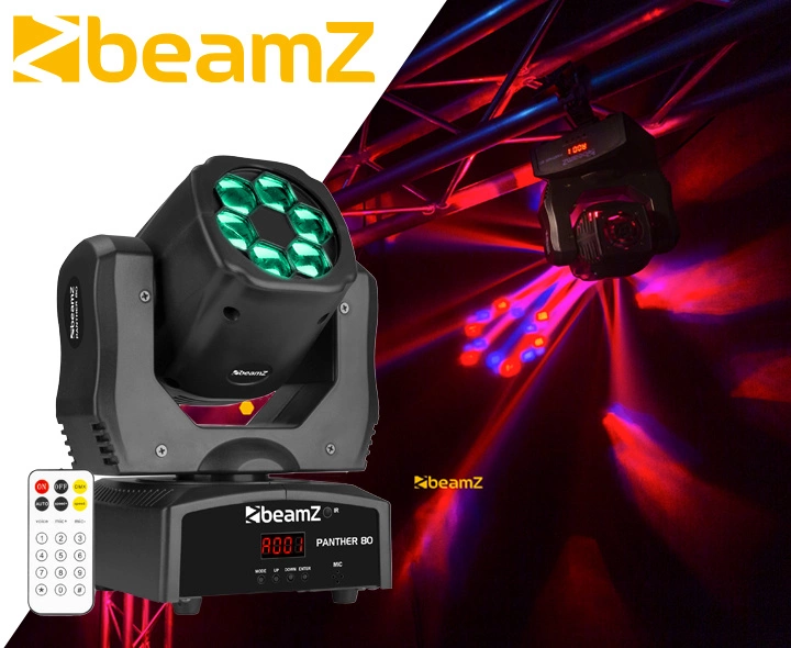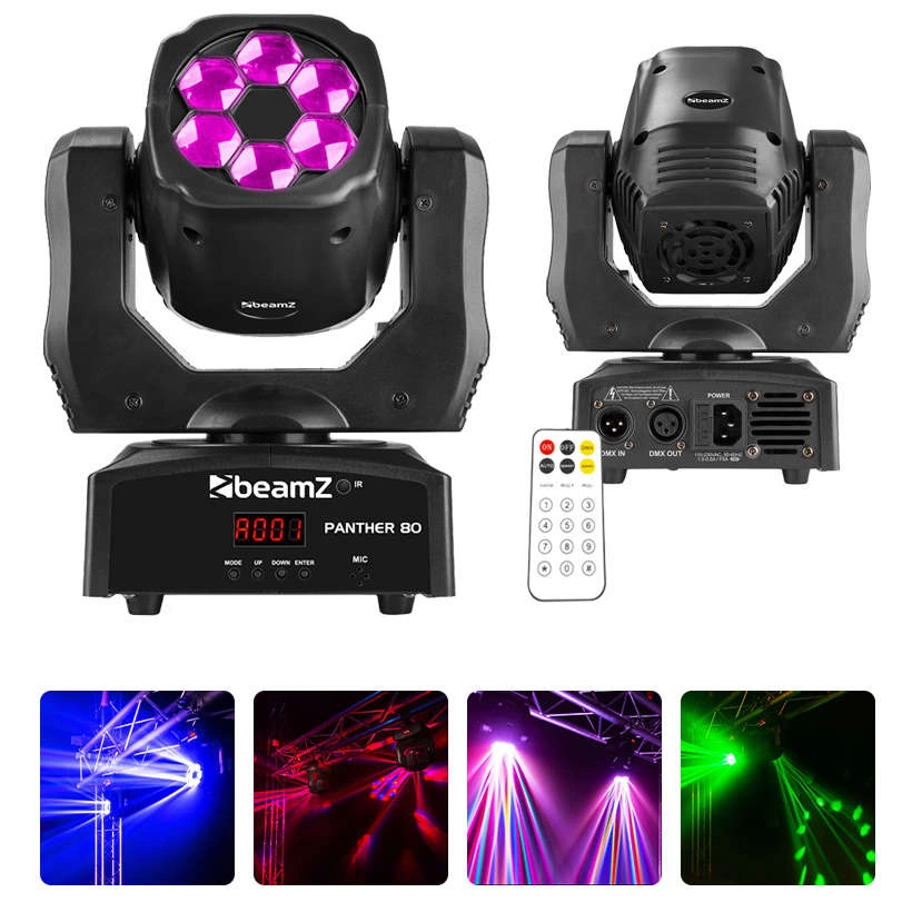 Z ruchomą głową BeamZ Panther 80 możesz tworzyć najpiękniejsze pokazy świetlne. Wyposażona jest w 6 diod LED zamontowanych na dysku. Ponieważ ten dysk może obracać się w nieskończoność w obu kierunkach, Panther 80 zapewnia wyjątkowy i piękny efekt. Ruchoma głowa posiada również 6 diod LED o mocy 12W na diodę, co zapewnia bardzo wysoką moc świetlną, są to diody RGBW, dzięki czemu ruchoma głowa może wytwarzać szeroką gamę kolorów, w tym kolory pastelowe.
