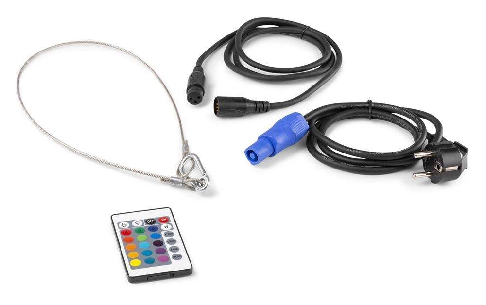 - Akcesoria Kabel DMX, wspornik montażowy, kabel zasilający, pilot zdalnego sterowania, przewód bezpieczeństwa