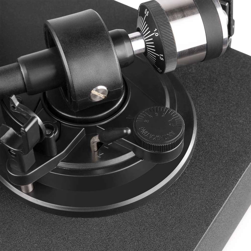Być może jedna z najbardziej niejasnych funkcji gramofonu, ale na pewno nie bez znaczenia! Podczas obracania płyty igła jest niejako ciągnięta w kierunku środka. Ta siła ciągnąca w kierunku środka może zostać zniwelowana za pomocą antyskatingu, dzięki czemu obie strony rowka mogą być bezbłędnie skanowane w celu uzyskania doskonałej i szczegółowej reprodukcji stereo.