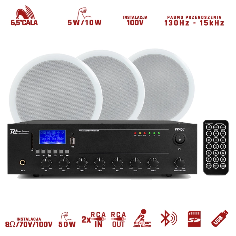 Power Dynamics PPA50 to wzmacniacz 100 V o mocy 50 W. Dzięki temu idealnie nadaje się do niewielkich podkładów muzycznych lub nagłośnienia, np. w sklepach, barach, poczekalniach itp. Wzmacniacz jest wyposażony w Bluetooth do bezprzewodowego przesyłania dźwięku np. z telefonu lub tabletu. W zestawie znajduje się również odtwarzacz MP3. Pilot jest nawet dołączony do odtwarzacza MP3. Wzmacniacz posiada również 2 wejścia liniowe RCA i 2 wejścia mikrofonowe jack (6,3 mm). Dzięki temu PPA50 może być używany zarówno w systemach muzycznych, jak i nagłaśniających (lub w połączeniu obu).
