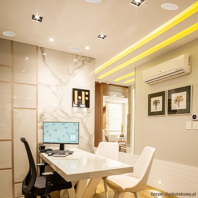 System ten obejmuje serię profesjonalnych, współosiowych, dwukierunkowych, wpuszczanych głośników sufitowych Power Dynamics ESCS5. Dwukierunkowa konstrukcja współosiowa zapewnia klarowność głosu i doskonałą definicję muzyki w porównaniu ze standardowymi jednostożkowymi głośnikami sufitowymi.