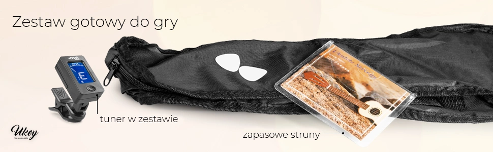 MAX UKEY Ukulele jest wyposażone w kilka bardzo interesujących akcesoriów. Na przykład dołączona jest torba, dzięki czemu można je łatwo zabrać ze sobą. Dołączony jest również cyfrowy tuner z klipsem, dzięki czemu można go zawsze dostroić w razie potrzeby. Zerwana struna? Nie ma problemu! Do zestawu dołączony jest zapasowy zestaw strun oraz 2 kostki, dzięki czemu możesz kontynuować grę.