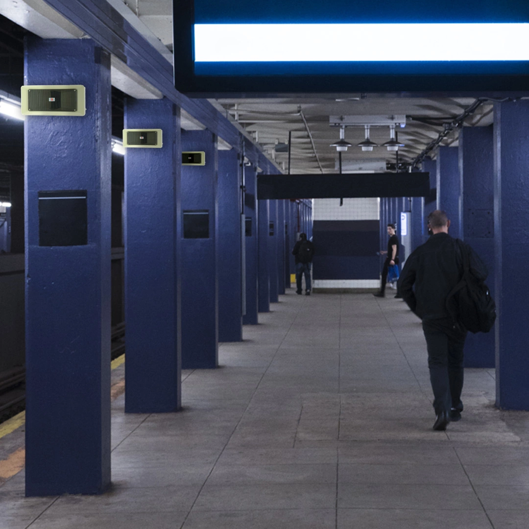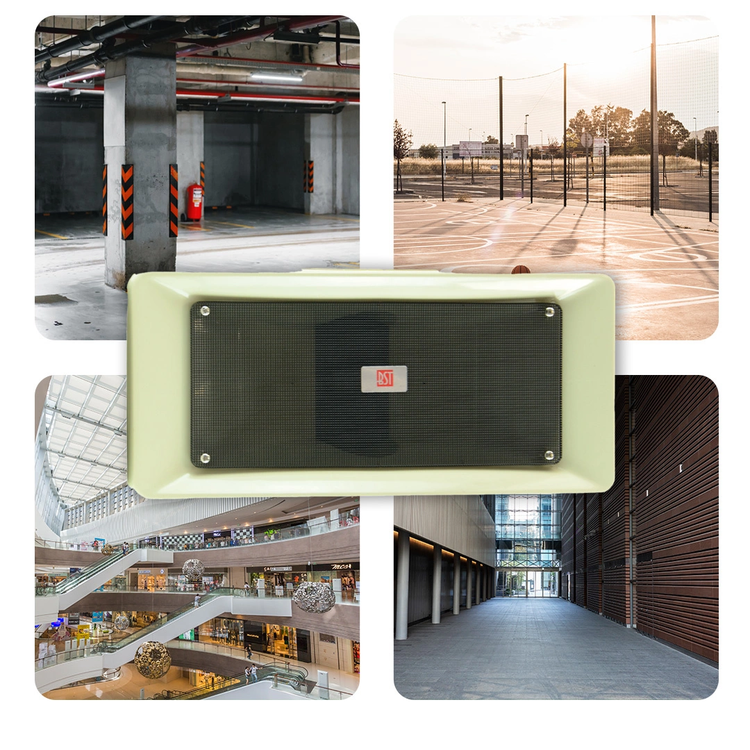 Głównym atutem tego projektora dźwięku jest szeroki kąt promieniowania dźwięku wynoszący 120° na poziomie i 100° na pionie. Oznacza to, że dźwięk jest szeroko rozprowadzany, obejmując duże obszary i zapewniając równomierne pokrycie dźwiękowe w przestrzeni. To doskonałe rozwiązanie dla miejsc takich jak supermarkety, baseny, domy towarowe, hale produkcyjne, dworce kolejowe, parkingi itp.