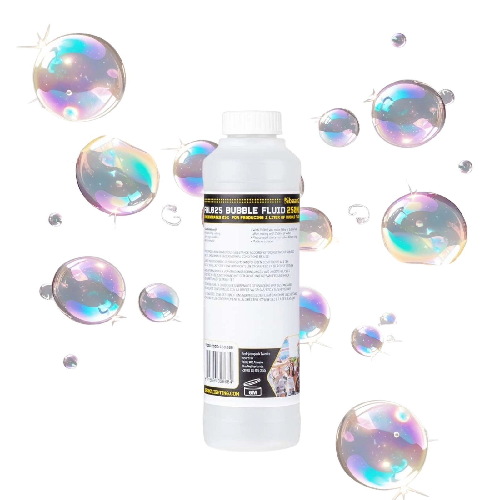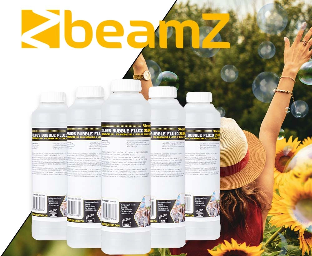 BeamZ FBL025 to płynny koncentrat z którego po zmieszaniu z wodą można uzyskać łącznie 1 litr płynu do wytwarzania baniek. Za pomocą tego koncentratu nie masz dużej butelki, co jest świetnym rozwiązaniem dla animatorów, ponieważ oszczędza miejsce, jest lekki, łatwy w transporcie. Ostateczny produkt po zmieszaniu z wodą nadaje się do prawie wszystkich maszyn do bąbelków. Płyn tworzy piękne bąbelki dla maksymalnego efektu.