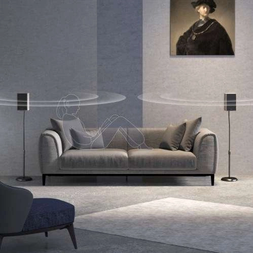 HTS212 może być używany uniwersalnie z dowolnym głośnikiem o maksymalnej wadze 4,5kg. Płyta montażowa, za pomocą której przymocowuje się głośnik do stojaka, nadaje się do różnych typów montażu. Płytkę można również zamontować poziomo, dzięki czemu głośnik stanie na stojaku zamiast na nim wisieć.
