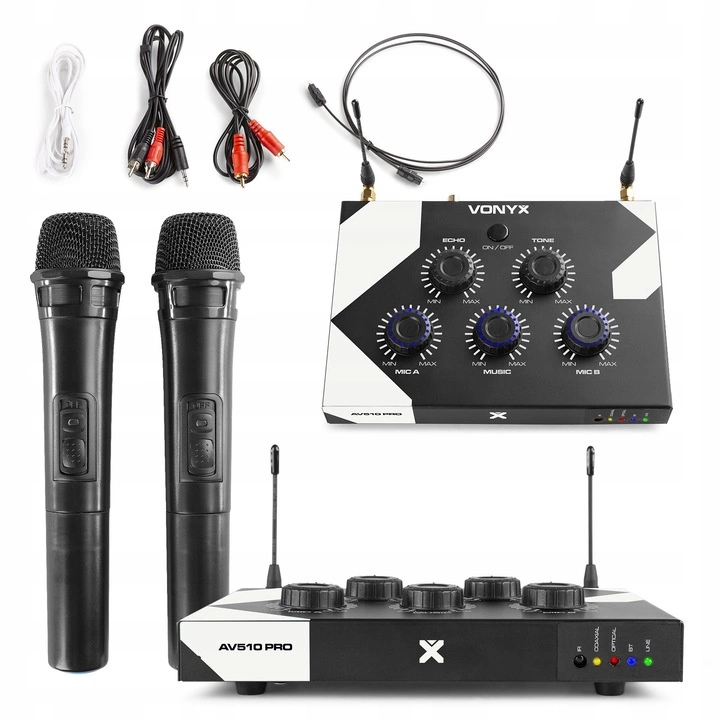 Zestaw karaoke AV510 jest dostarczany z różnymi kablami umożliwiającymi połączenie między podłączonymi do niego urządzeniami. Posiada wejście optyczne/ koncentryczne, wejście, wyjście stereo AUX jack 3,5mm. Oprócz tych wszystkich kabli, Vonyx AV510 jest wyposażony w pilota.