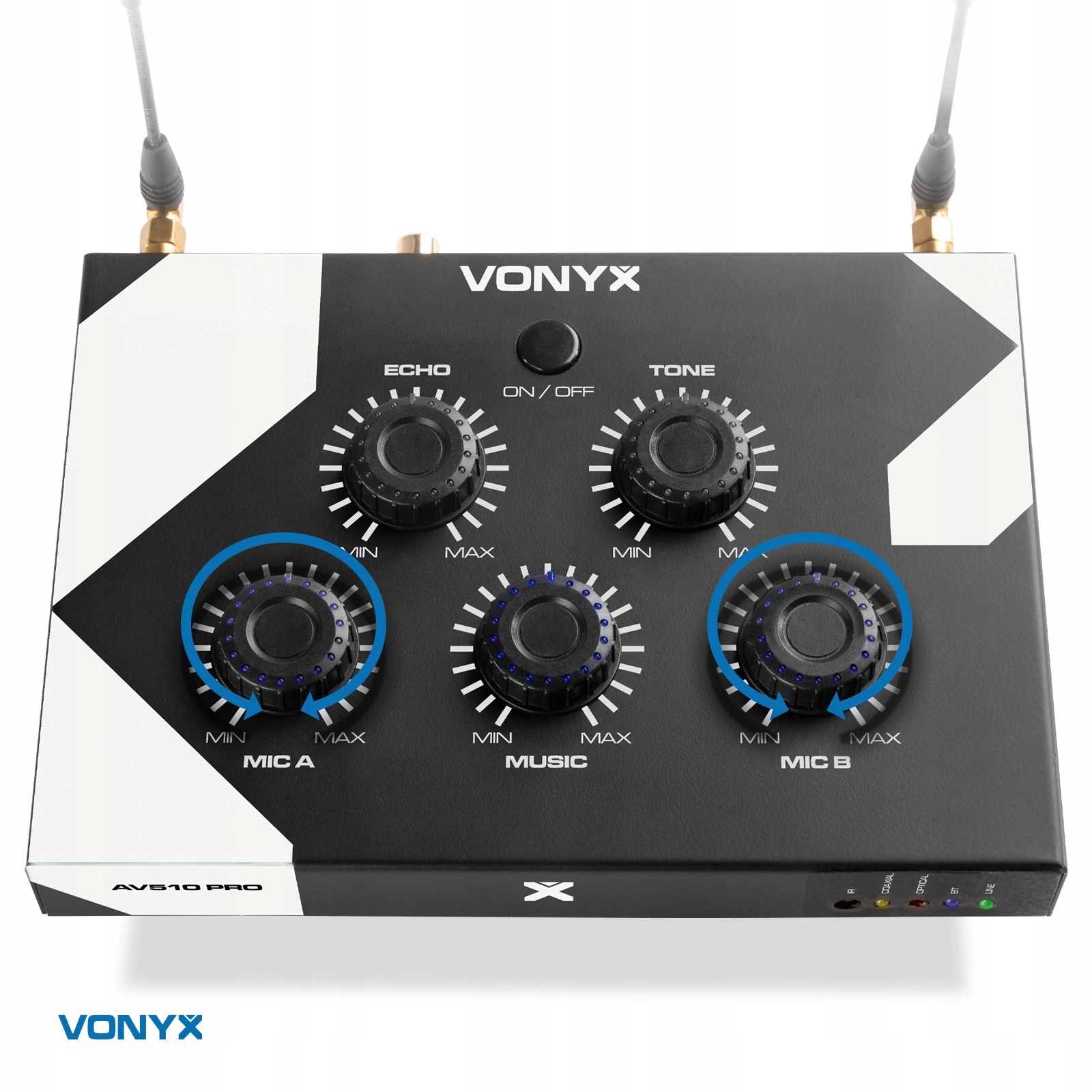 Zestaw AV510 jest wyposażony w 2 mikrofony UHF (Ultra High Frequency) w zakresie od 864,5 do 863,1 MHz. Mikrofony UHF charakteryzują się wolną od zakłóceń transmisją i takie mikrofony często znajdują zastosowanie w zastosowaniach profesjonalnych. Dzięki AV510 masz więc pewność dobrego transferu sygnału bez zakłóceń. Vonyx AV510 posiada podświetlane przyciski do regulacji głośności każdego mikrofonu.