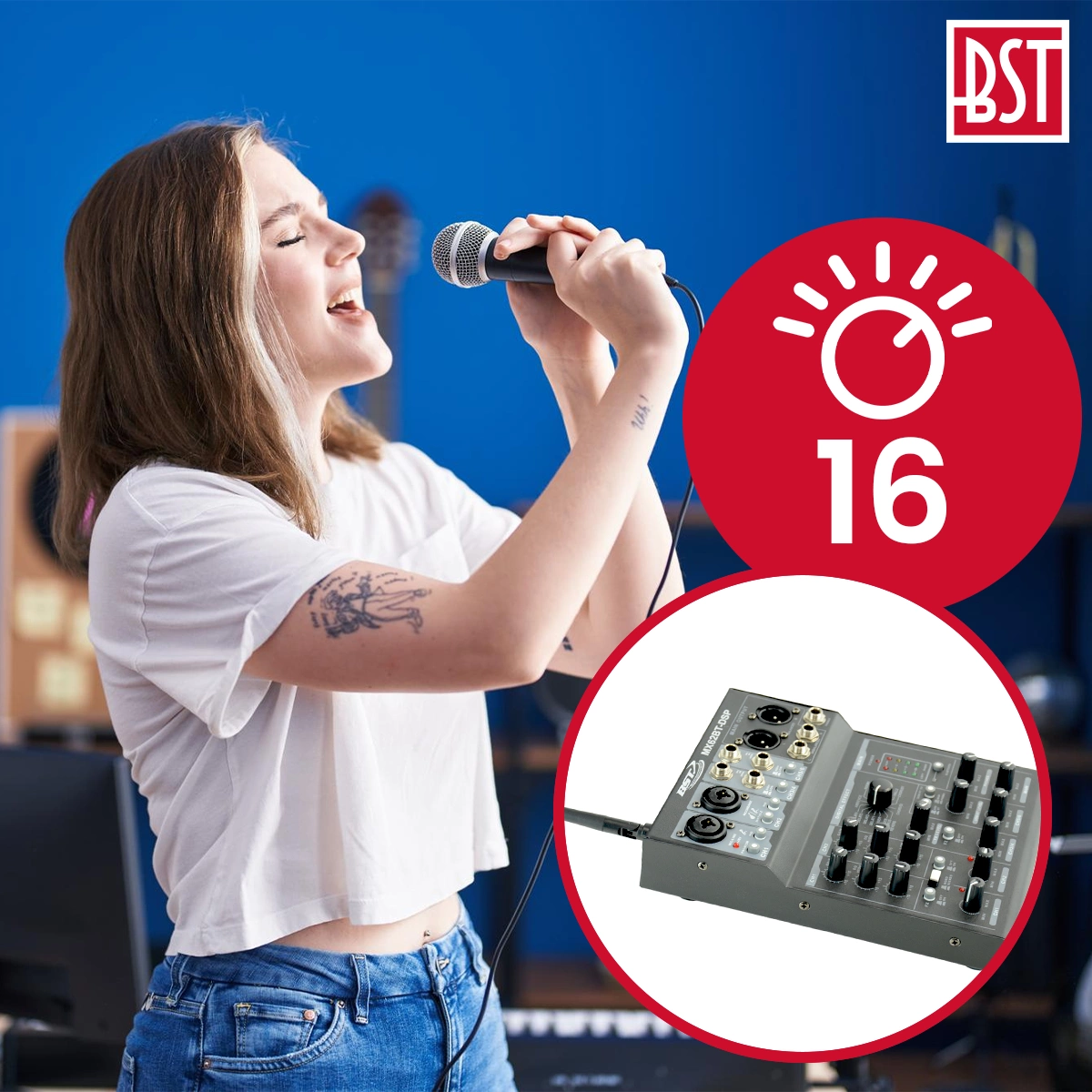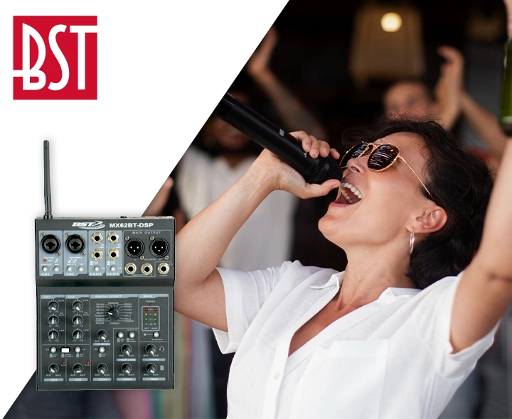 6-kanałowy mikser z Bluetooth, DSP (Digital Sound Processor) i kartą dźwiękową. Cyfrowy procesor dźwięku sprawia, że mikser jest idealny dla początkującego piosenkarza lub na wieczór karaoke. Mikser może być również używany do małych aplikacji na żywo, co czyni go kompaktowym i wszechstronnym.