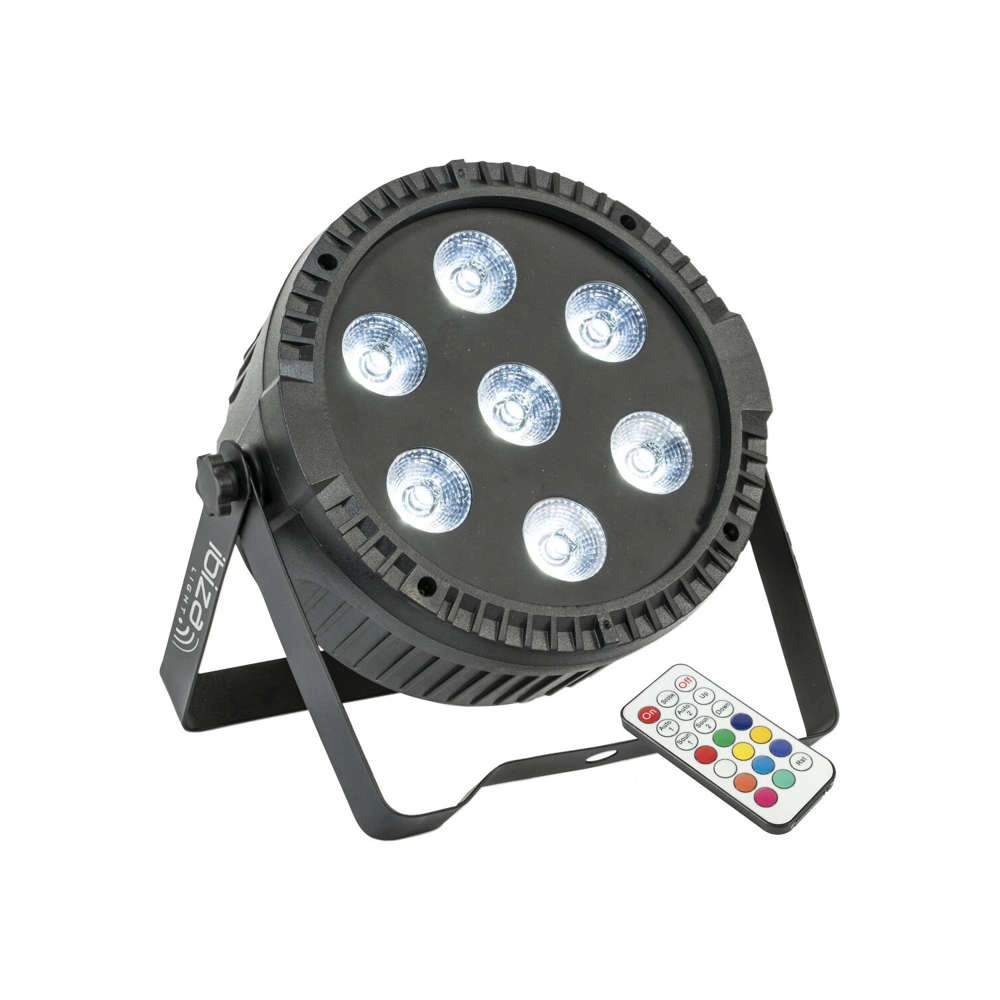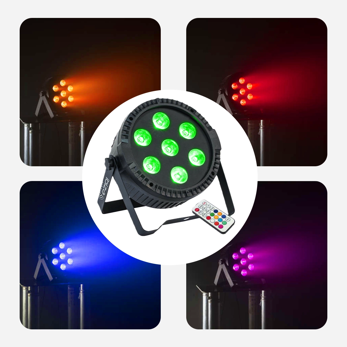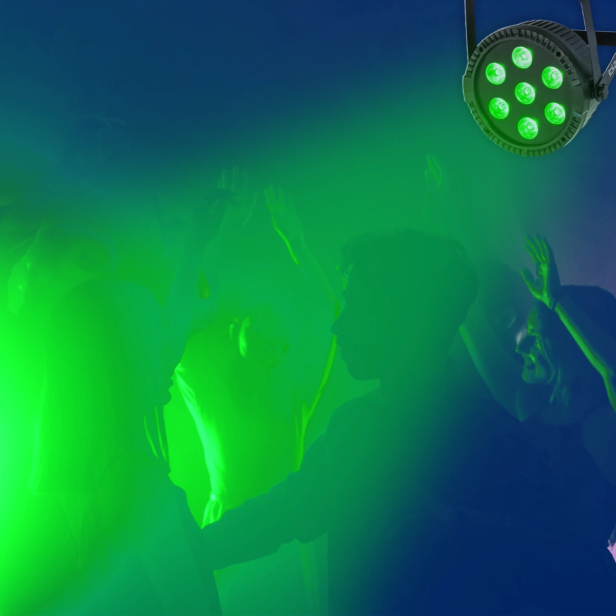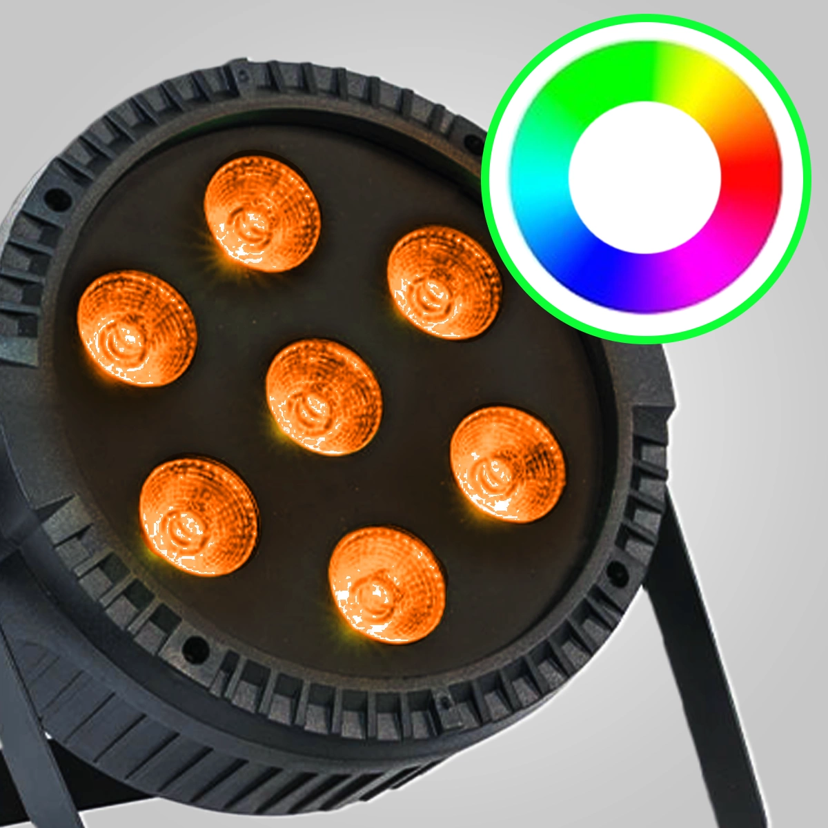 Bardzo przystępna cenowo lampa LED o dużej intensywności światła. Tak wysoką intensywność uzyskuje się dzięki 7 diodom LED RGBW o mocy 6W na jedną diodę. RGBW oznacza, że diody LED przyjmują kolor czerwony, zielony, niebieski i biały. Mieszając te cztery kolory, można uzyskać inne barwy, takie jak żółty lub fioletowy. Dodatek bieli gwarantuje, że możliwe są również kolory pastelowe.