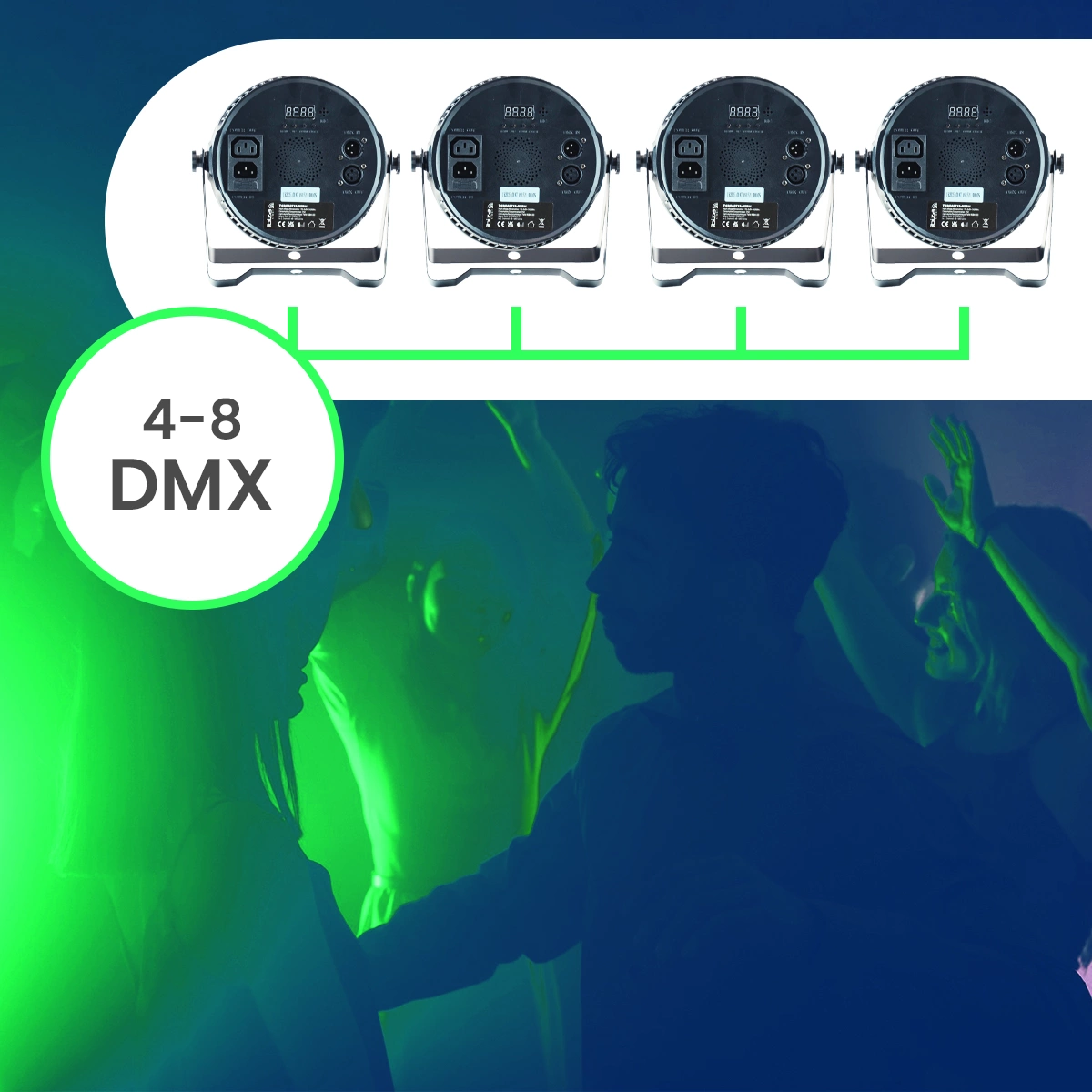 W przypadku instalacji wielu spotów możliwe jest połączenie zasilania i sygnału DMX pomiędzy wieloma spotami. W ten sposób do jednego gniazda można podłączyć wiele spotów. To sprawia, że THINPAR7X6-RGBW jest również idealny dla mobilnych DJ-ów lub pokazów Drive-In, którzy mogą szybko i łatwo skonfigurować i zdemontować pokaz świetlny.