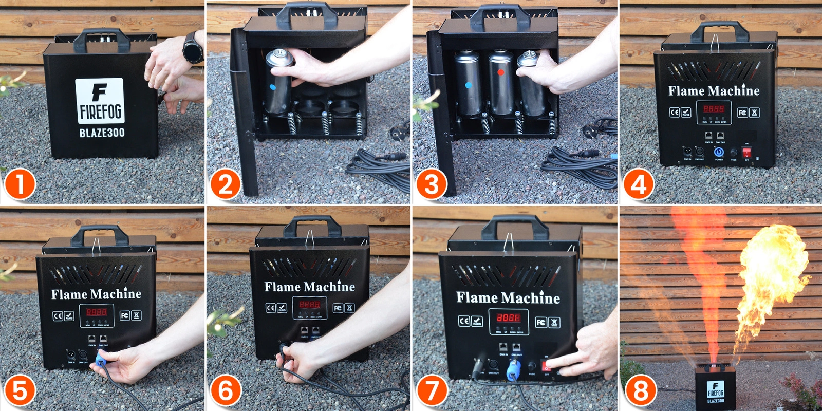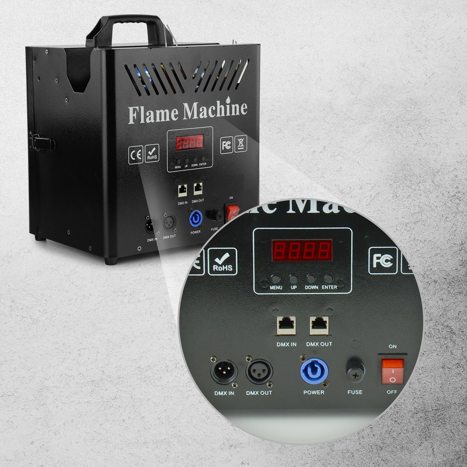 Dzięki trybowi sterowania DMX512 użytkownik ma pełną kontrolę nad urządzeniem, co umożliwia synchronizację z innymi elementami wystawy lub pokazu. Wyrzutnia zapewnia pokrycie obszaru do 3m², a płomienie mogą osiągać wysokość od 1 do 3 metrów, co tworzy dynamiczny i widowiskowy efekt wizualny. Wytwornica może puszczać słupy ognia trzy jednocześnie, bądź słupy pojedyncze.