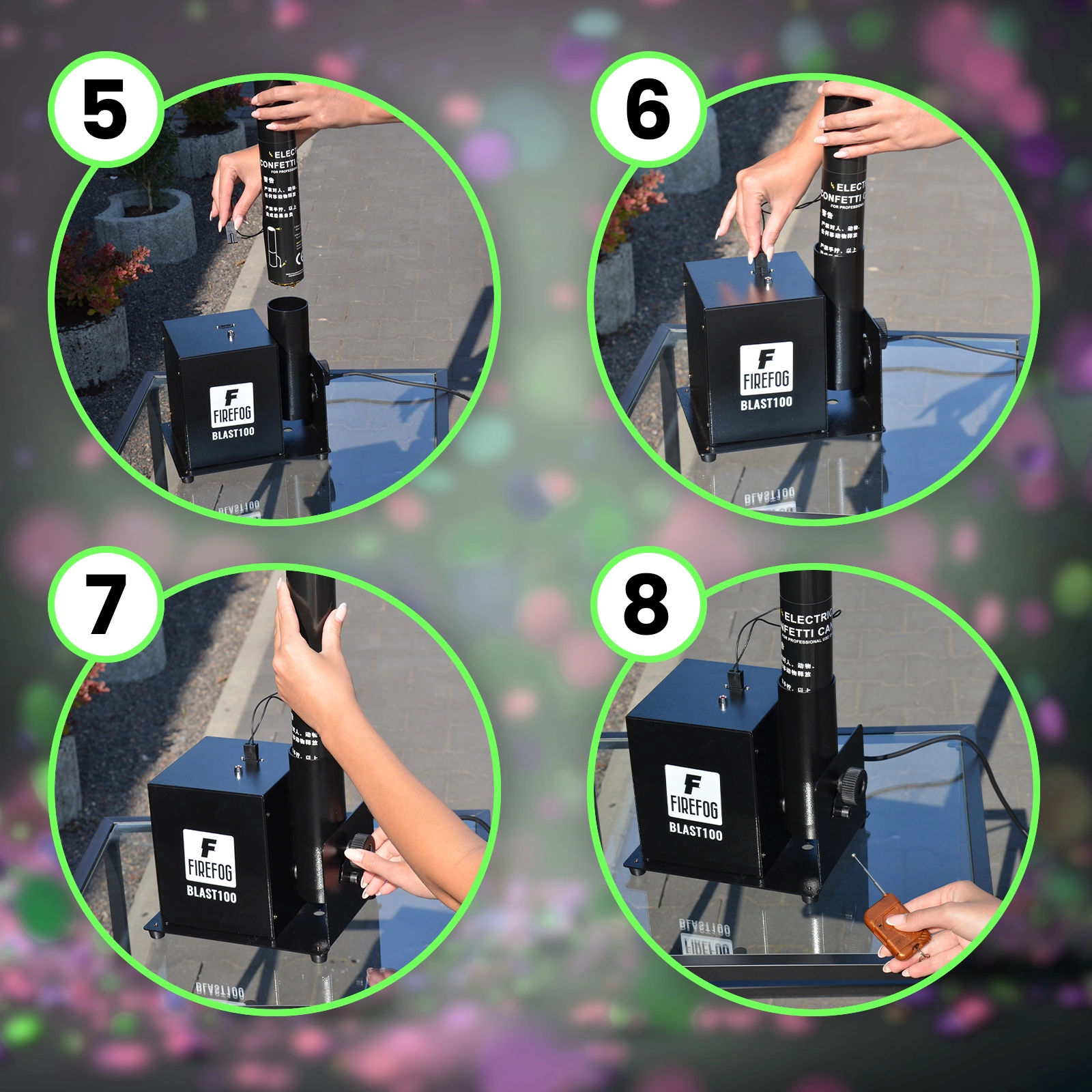 - Materiał eksploatacyjny: elektryczna tuba konfetti (wkładana w specjalną tubę i podłączana kablem do wyrzutni)