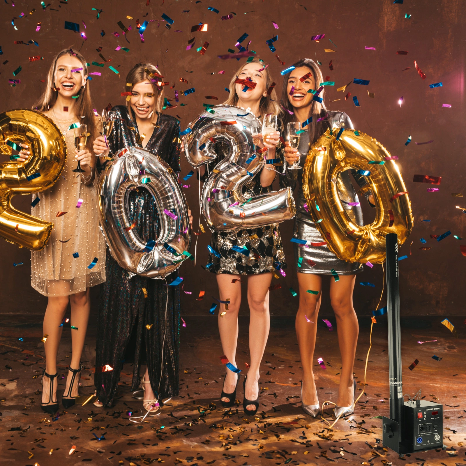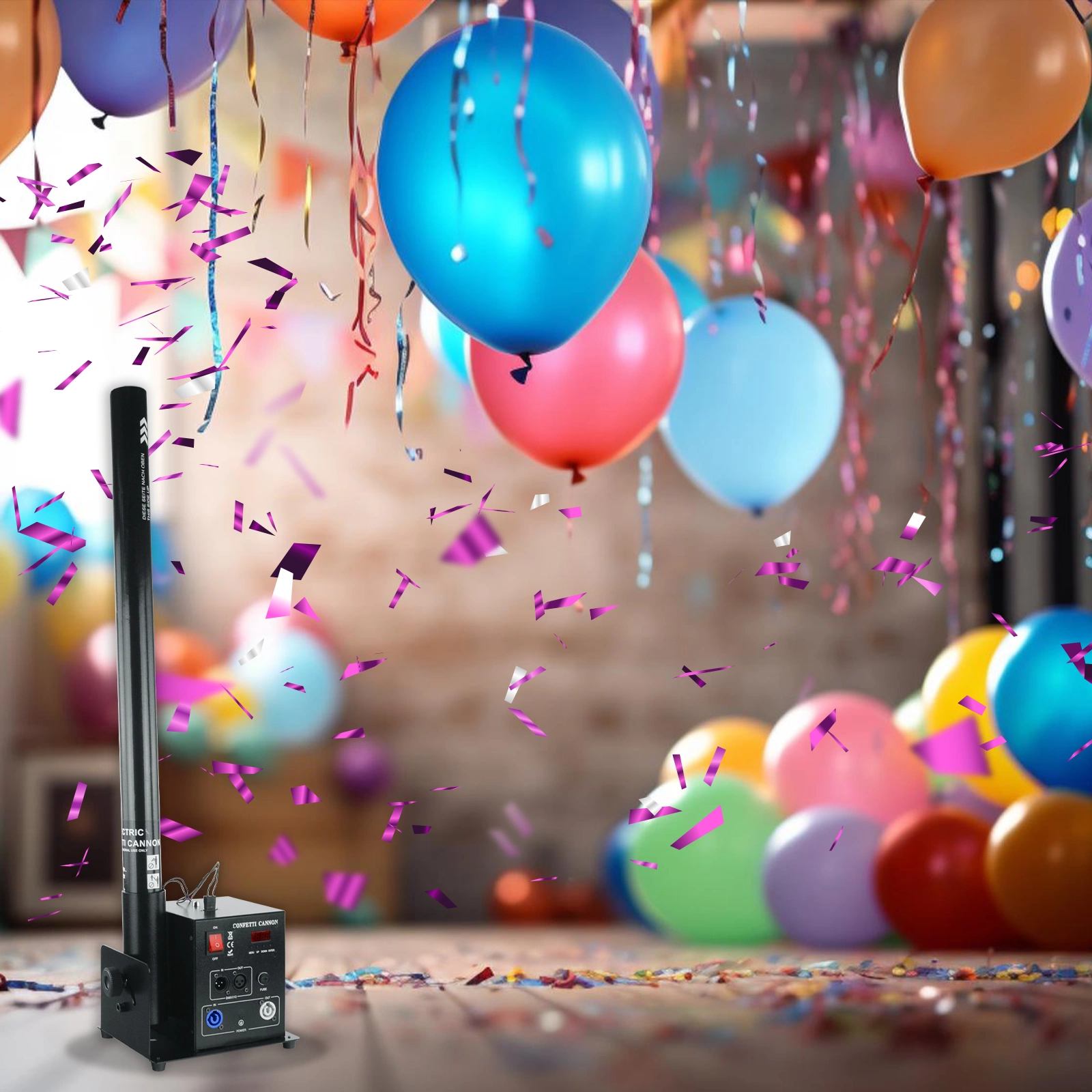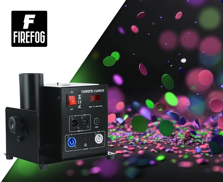 Pojedyncza wyrzutnia konfetti jest zdolna do wystrzeliwania konfetti na odległość od 8 do 10 metrów (kat wystrzału regulowany manualnie) tworząc spektakularny efekt, który zachwyci każdą publiczność. Urządzenie korzysta z elektrycznych tub konfetti, które są łatwe do wymiany i zapewniają różnorodność kolorów i kształtów konfetti, dostosowanych do charakteru wydarzenia.
