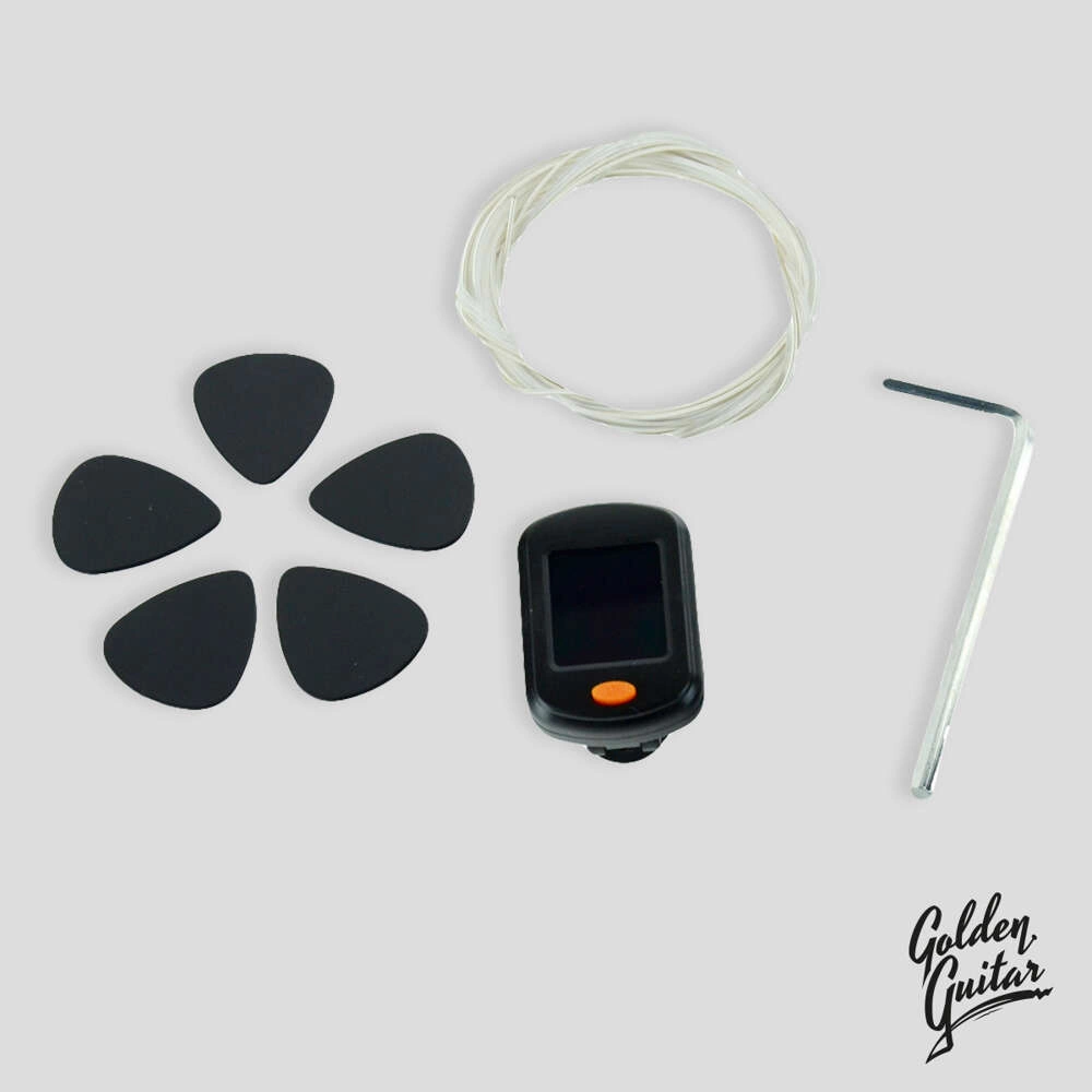 Gitara klasyczna Golden Guitar 4/4 GK38NAT to znakomity wybór zarówno dla początkujących, jak i bardziej zaawansowanych gitarzystów, którzy cenią sobie jakość i wygodę gry za niewielką cenę. Komplet akcesoriów sprawia, że jest to świetny zestaw startowy, który pozwala od razu zacząć przygodę z muzyką. Profesjonalnie dobrane materiały zapewniają doskonałe brzmienie, a solidna konstrukcja gitary gwarantuje trwałość i niezawodność przez długi czas.