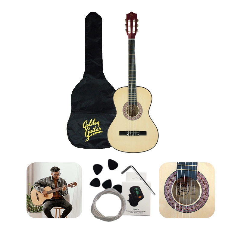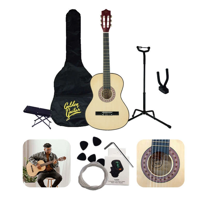 Zestaw: Gitara klasyczna 4/4 38" kolor naturalny Golden Guitar+ akcesoria+ 2x statyw+ podnóżek gitarowy