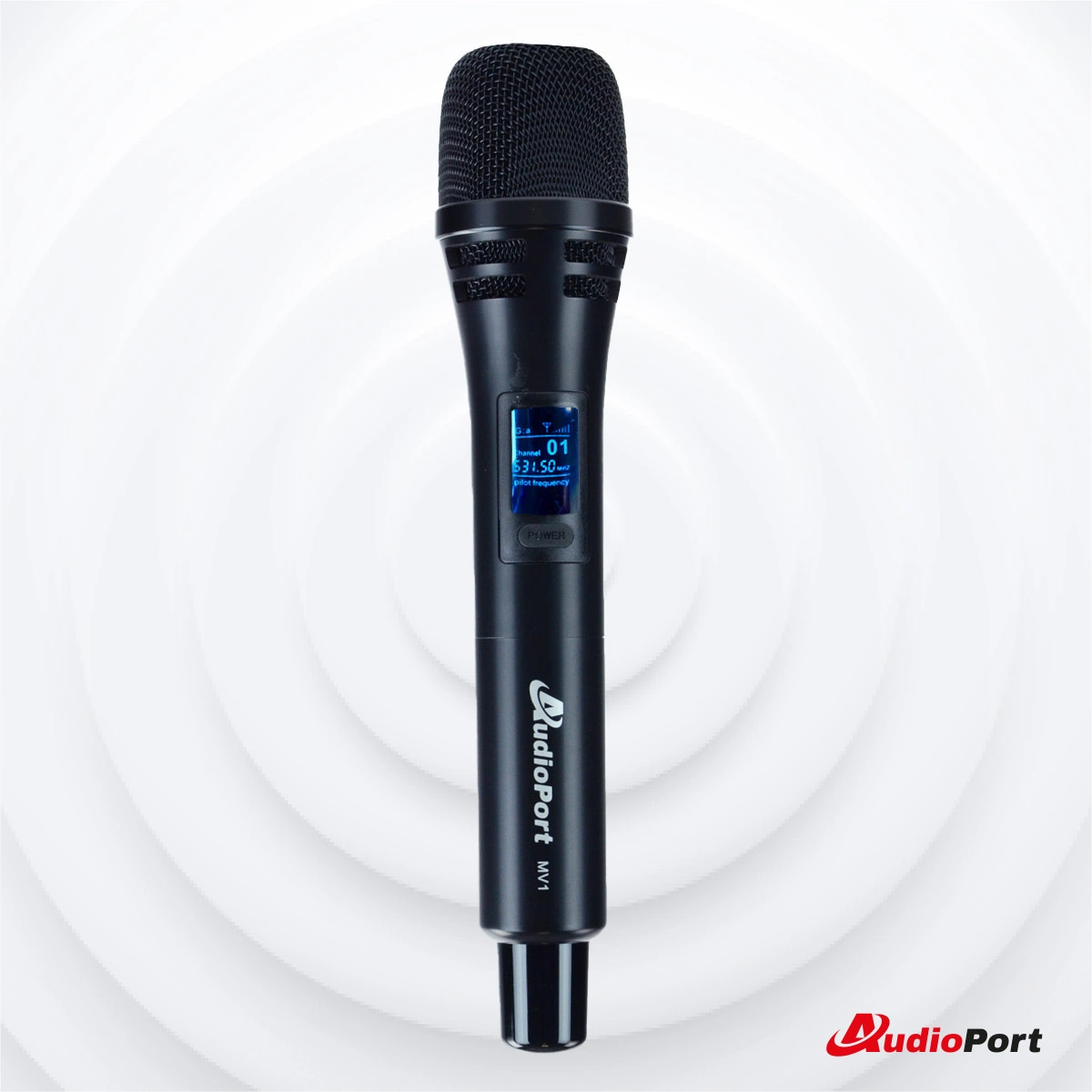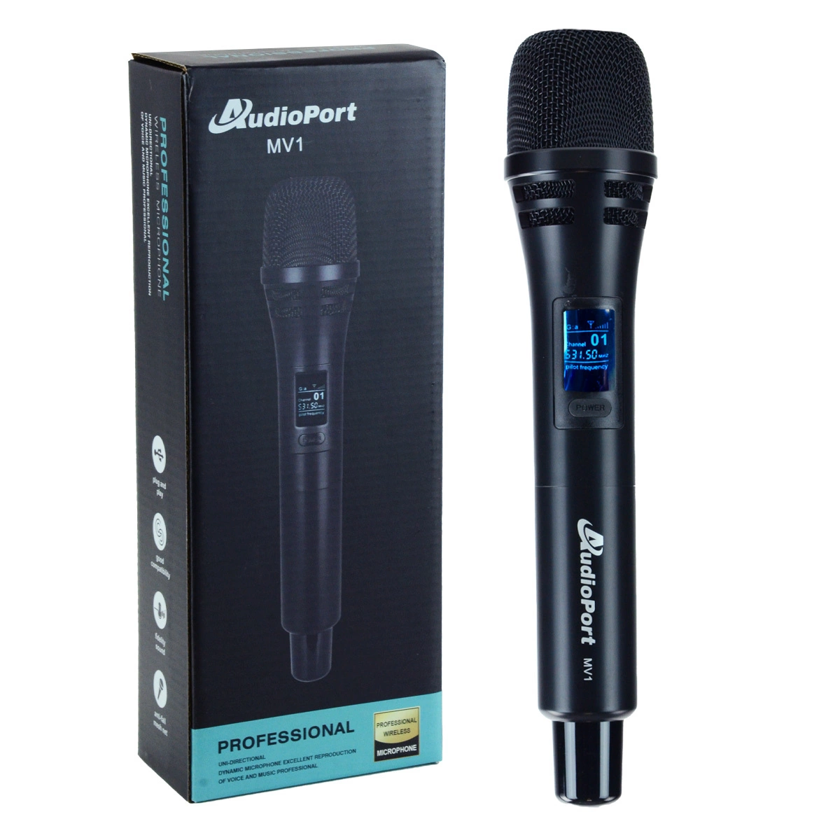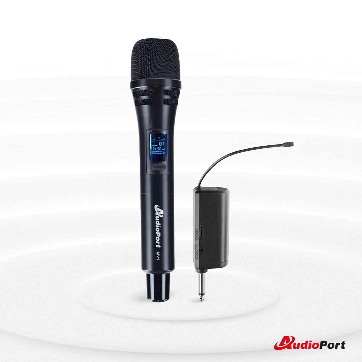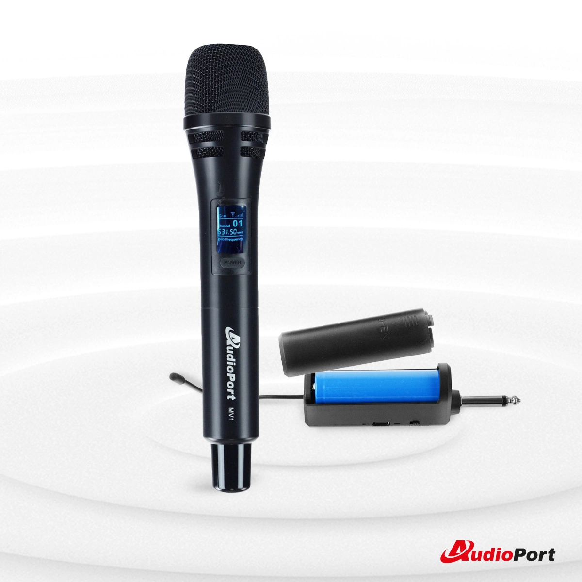 Audioport MV1 to ręczny mikrofon bezprzewodowy UHF, zapewniający stabilną transmisję dźwięku. Jego jednokierunkowa charakterystyka kardioidalna skutecznie redukuje niepożądane dźwięki z otoczenia, gwarantując czystą i wyraźną jakość audio.
