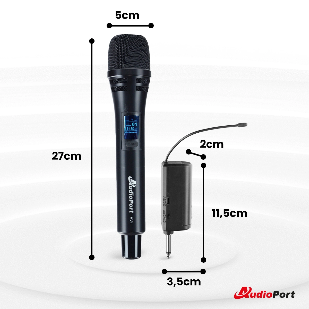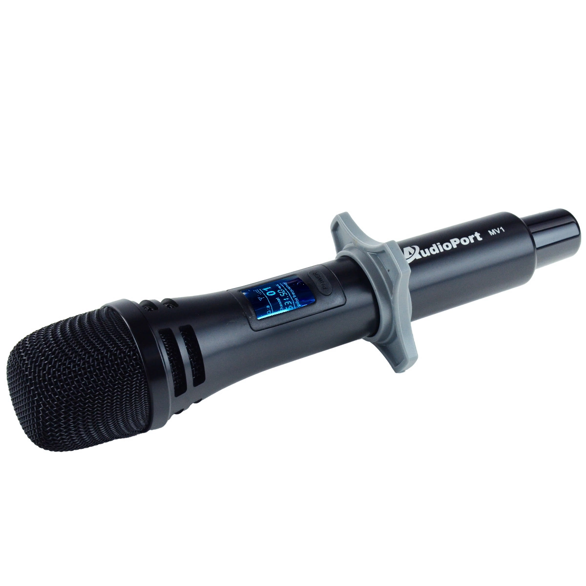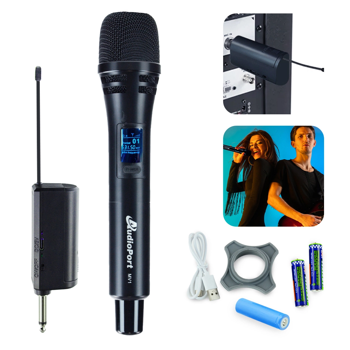 Audioport MV1 to ręczny mikrofon bezprzewodowy UHF, zapewniający stabilną transmisję dźwięku. Jego jednokierunkowa charakterystyka kardioidalna skutecznie redukuje niepożądane dźwięki z otoczenia, gwarantując czystą i wyraźną jakość audio.