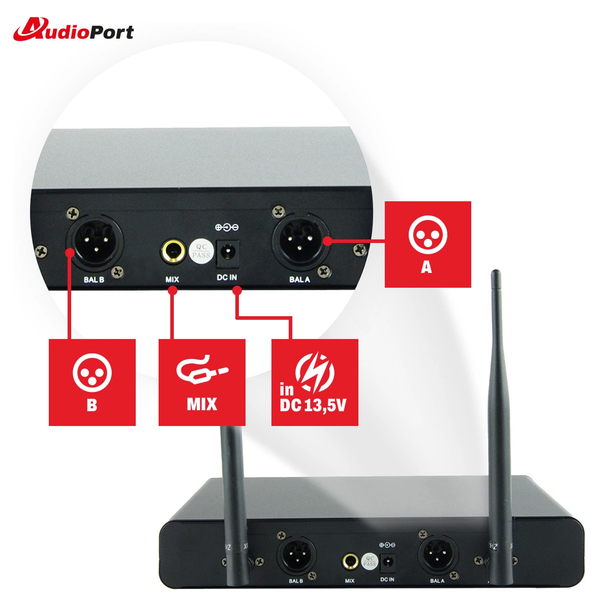 Umożliwia łatwe przełączanie częstotliwości w przypadku zakłóceń. Dzięki złączu jack 6,3mm (kabel w zestawie) oraz dwóm wyjściom XLR (3-pinowym), zestaw można podłączyć do różnych systemów nagłośnienia. Nadajniki (bodypacki) mają wyświetlacze pokazujące wybraną częstotliwość oraz poziom naładowania baterii, co ułatwia obsługę, szczególnie podczas profesjonalnych zastosowań.