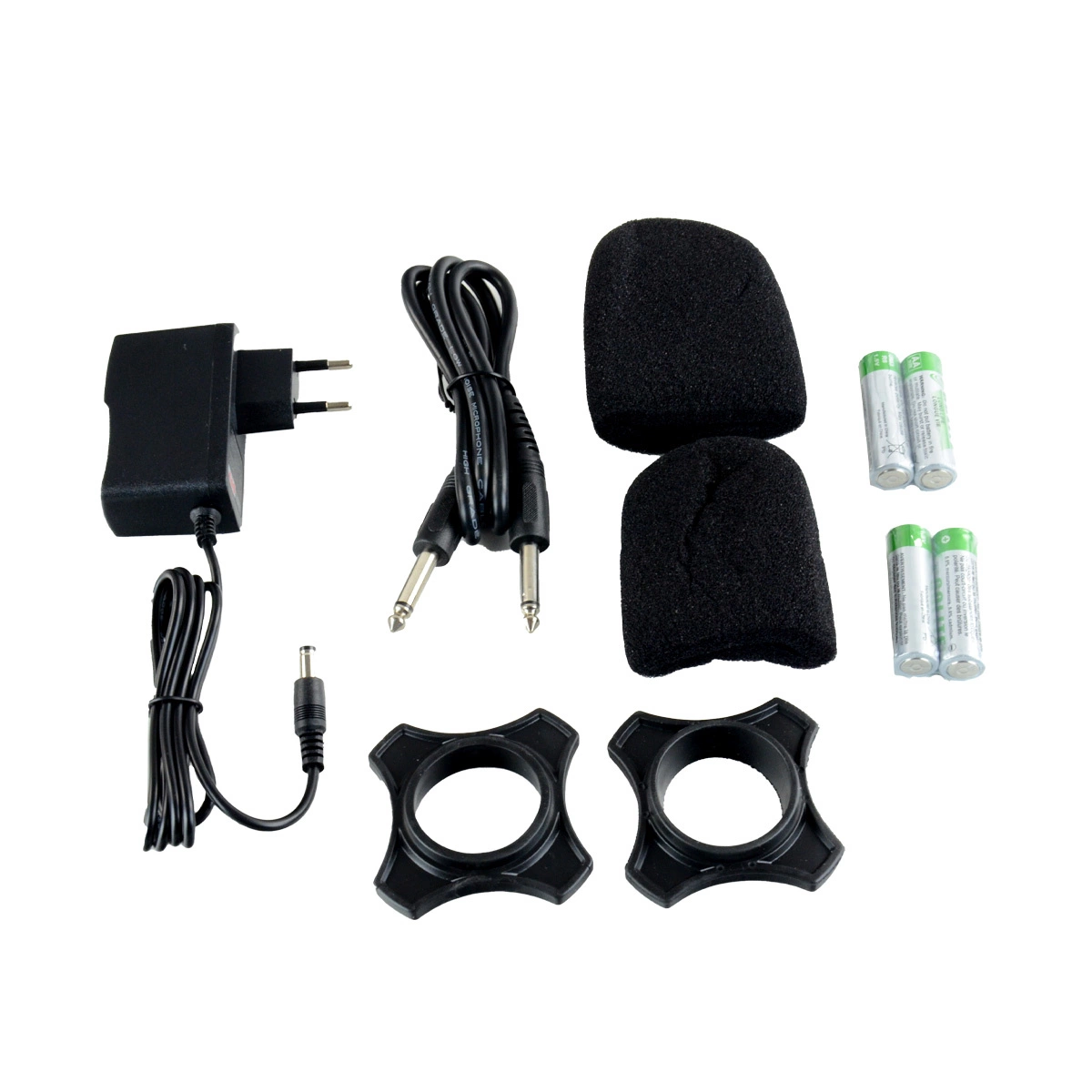 - W zestawie: 2x mikrofon doreczny UHF, stacja, kabel Jack 6,3mm, zasilacz, 4x bateria R6 1,5V, 2x osłona przeciwwietrzna, 2x nasadka stabilizująca do mikrofonu