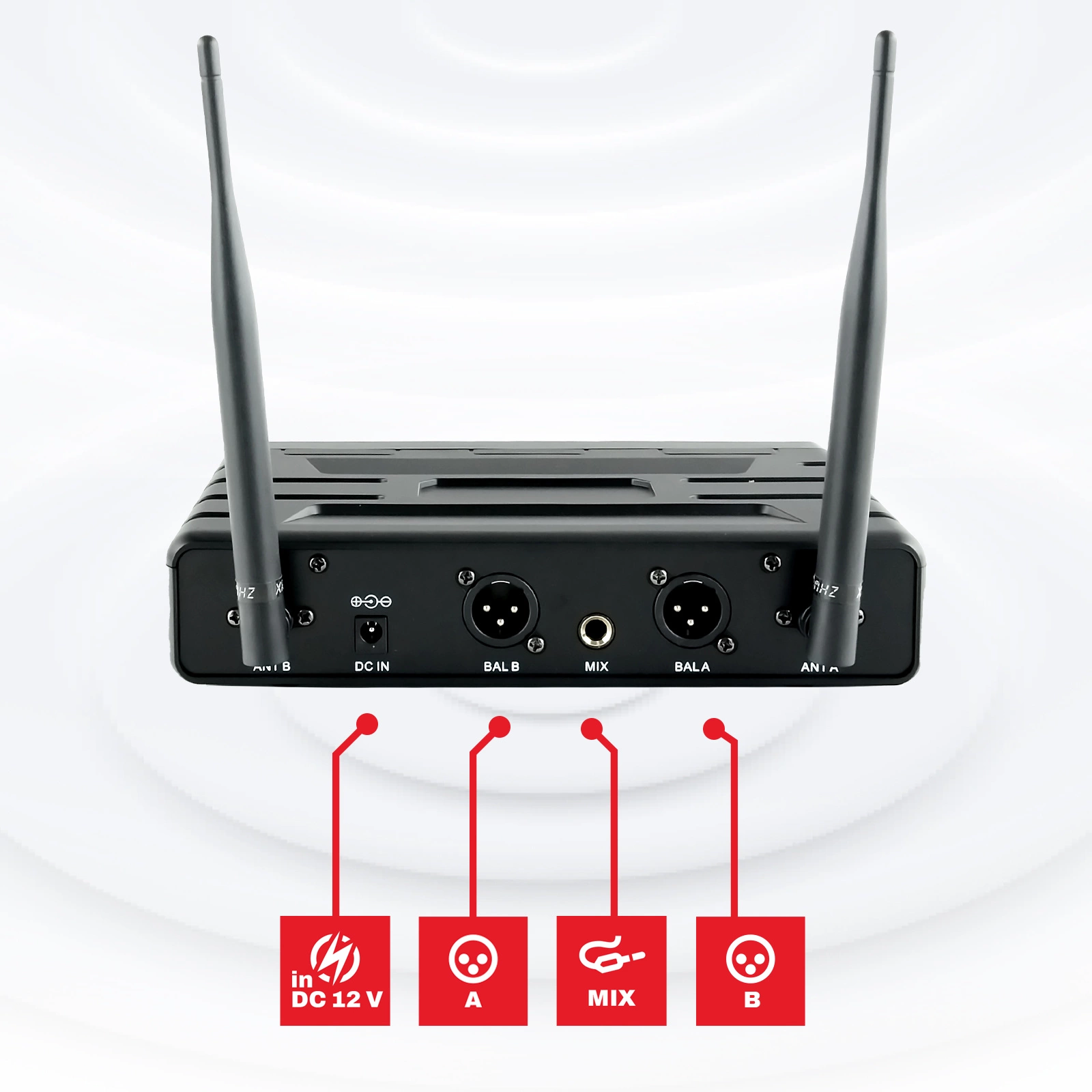 System jest wyposażony w odbiornik z wyjściami jack 6,3mm oraz XLR, dzięki czemu można go łatwo podłączyć do profesjonalnego sprzętu nagłośnieniowego. Do zestawu dołączono niezbędny kabel jack 6,3mm, co pozwala na szybkie rozpoczęcie pracy.