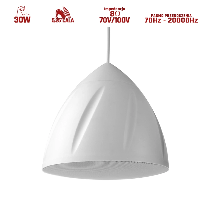 Dzięki Power Dynamics PDS40W możesz w schludny sposób zapełnić pomieszczenia z wysokim sufitem w stylowy dodatek, z którego wydobywają się dźwięki muzyki. Biały głośnik wiszący, będzie elegancko wyglądał w każdym wnętrzu. Ponieważ kabel o długości 2,2 metra jest wewnętrznie wyposażony w stalowy rdzeń, nie jest konieczne stosowanie osobnego kabla stalowego i kabla sygnałowego, dzięki czemu wszystko wygląda bardzo schludnie i szczelnie wykończone. Głośnik nadaje się do użytku w systemach 100V, ale można go również podłączyć do konwencjonalnych wzmacniaczy z ustawieniem 8Ohm. PDS40W nadaje się zarówno do muzyki, jak i mowy i może być używany w kościołach, restauracjach, sklepach itp.