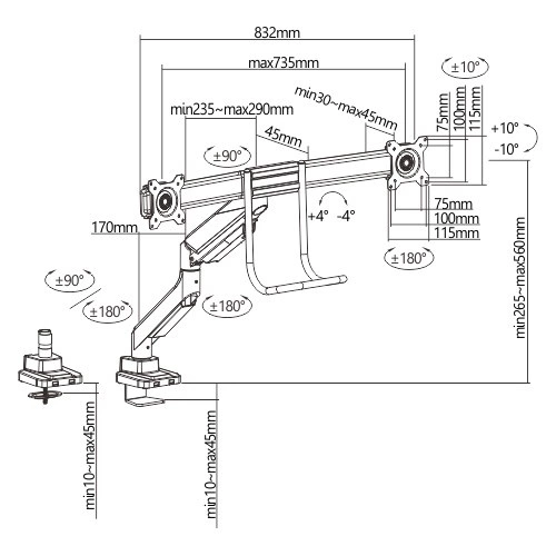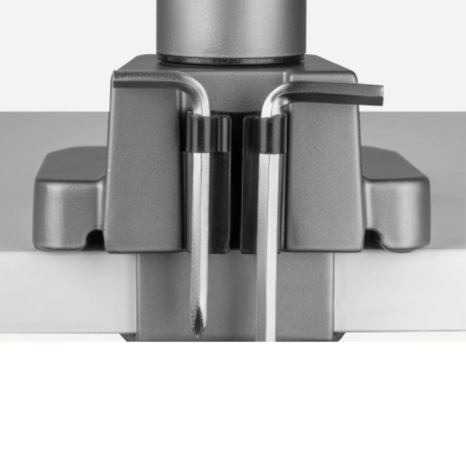 MAD20F można zamontować na dwa sposoby. Za pomocą dołączonego zacisku ramię monitora można łatwo przymocować do stołu lub biurka bez wiercenia. Inną opcją jest wywiercenie otworu 10mm, po którym ramię monitora można przymocować do blatu stołu za pomocą dostarczonej śruby, podkładki i nakrętki motylkowej. Po umieszczeniu monitorów kable można schować w ramionach.