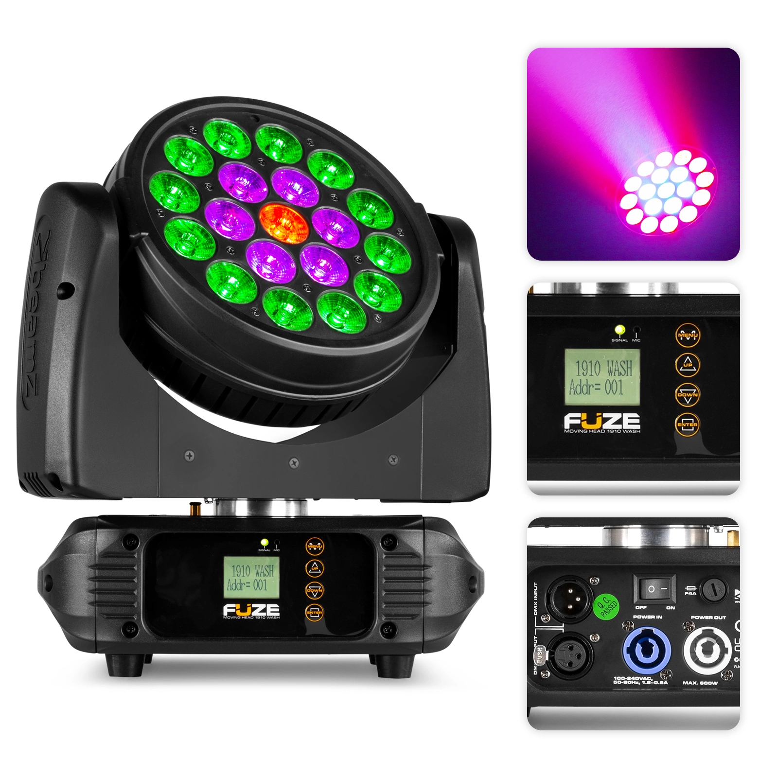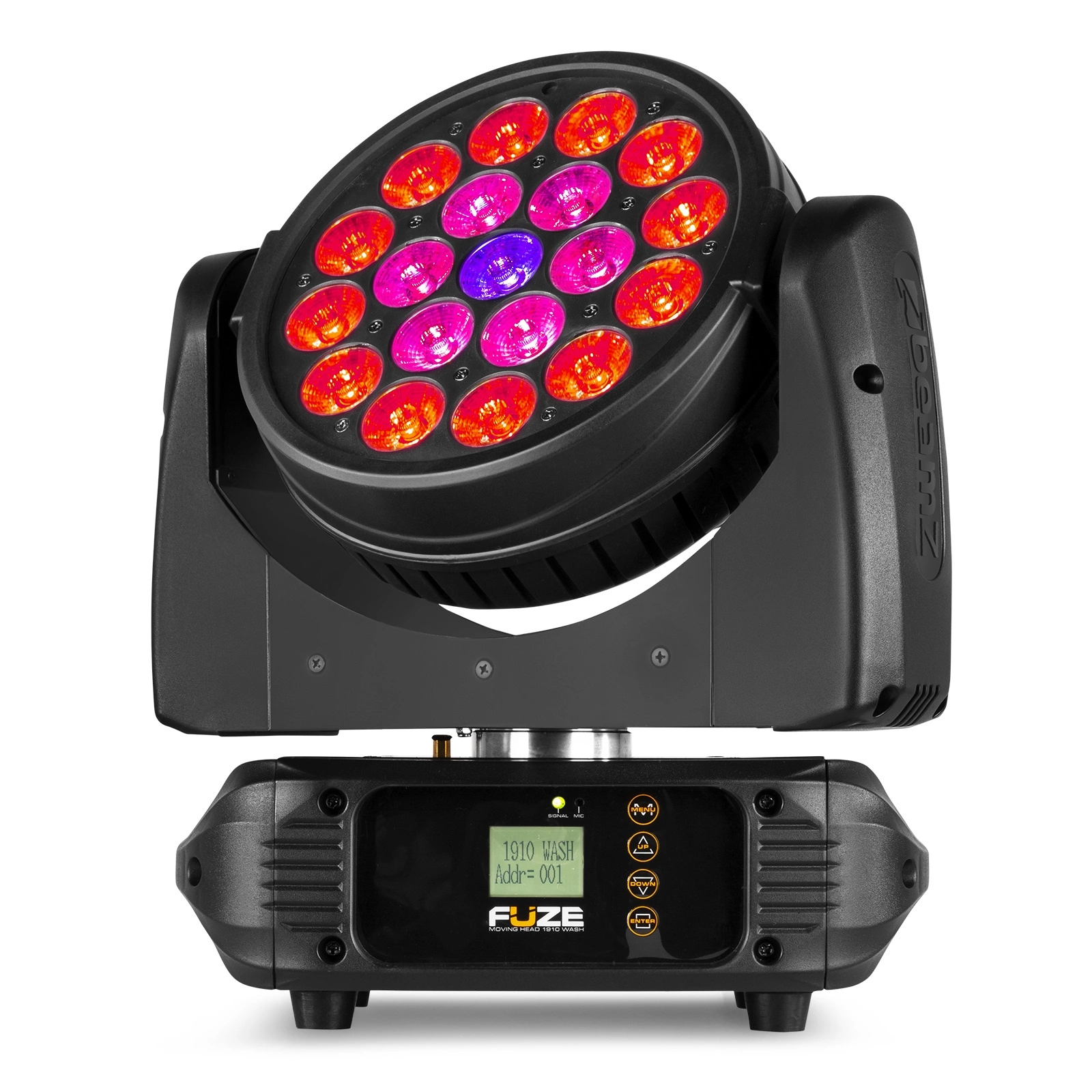 19 diod LED FUZE1910 zapewnia niespotykaną ilość światła. Ponieważ są one podzielone na 3 pierścienie, można stworzyć piękne efekty na samej ruchomej głowie. Diody LED to diody LED 4 w 1 w kolorach czerwonym, zielonym, niebieskim i białym. Mieszając te kolory lub bawiąc się intensywnością, za pomocą tej ruchomej głowy można stworzyć ogromną liczbę kolorów, w tym kolory pastelowe.