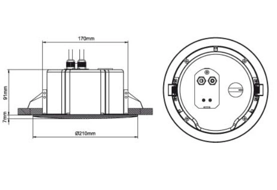 Ten 100V głośnik sufitowy jest montowany w odpowiednim wycięciu w suficie za pomocą sprężynowych klipsów montażowych. Zaciski bez wysiłku mocują głośnik na miejscu bez konieczności użycia śrub. Kable głośnikowe są podłączone do odpowiedniego wzmacniacza za pomocą zacisków sprężynowych, przy czym każdy zacisk utrzymuje kable bezpiecznie na miejscu, aby zapobiec ich wysuwaniu się.