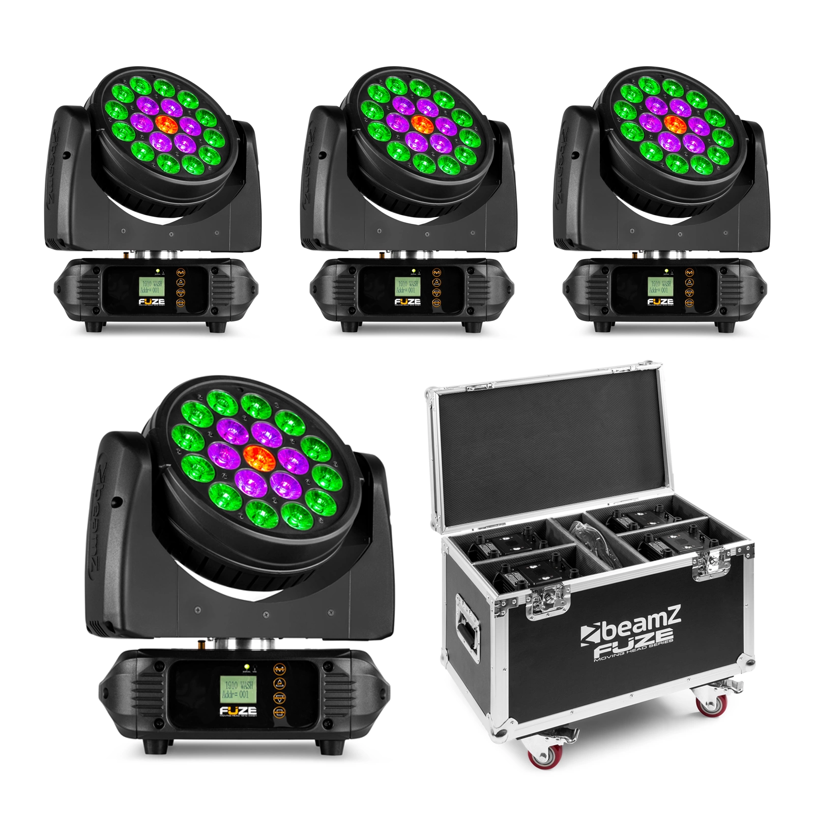- 4x Kompaktowa ruchoma głowa ze sterowaniem kołowym+ case
