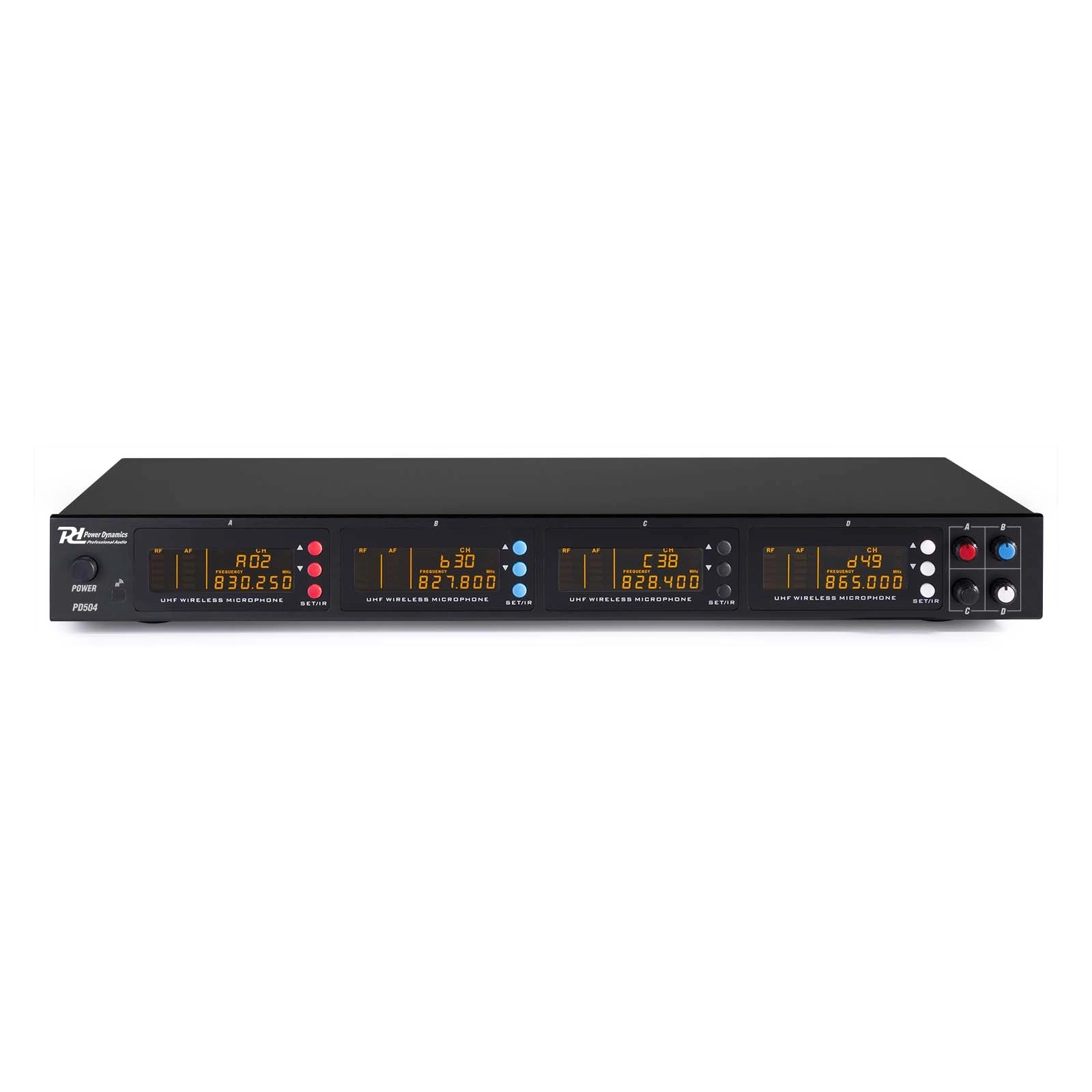 en imponująco brzmiący system bezprzewodowy Power Dynamics UHF pozwala na jednoczesną obsługę 4 mikrofonów. Każdy z nich jest oznaczony kolorami, co pozwala na szybką identyfikację mikrofonu.