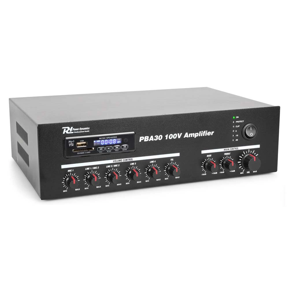 Power Dynamics PBA30 to kompaktowy wzmacniacz 100V o mocy 30W do zastosowania w mniejszych instalacjach. Wyposażony jest w odtwarzacz USB/ SD mp3, tuner FM, odbiornik Bluetooth oraz kilka wejść liniowych i mikrofonowych. Każdy kanał ma własną regulację głośności, a ustawienia basów i sopranów umożliwiają precyzyjne dostrojenie dźwięku. Wszystko to sprawia, że PBA30 jest ładnym, wszechstronnym wzmacniaczem w kompaktowej obudowie. Idealny do mniejszych instalacji, na przykład w barze z przekąskami, małym sklepie, recepcji lub poczekalni itp.